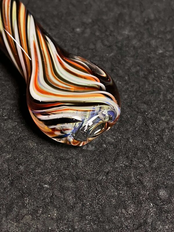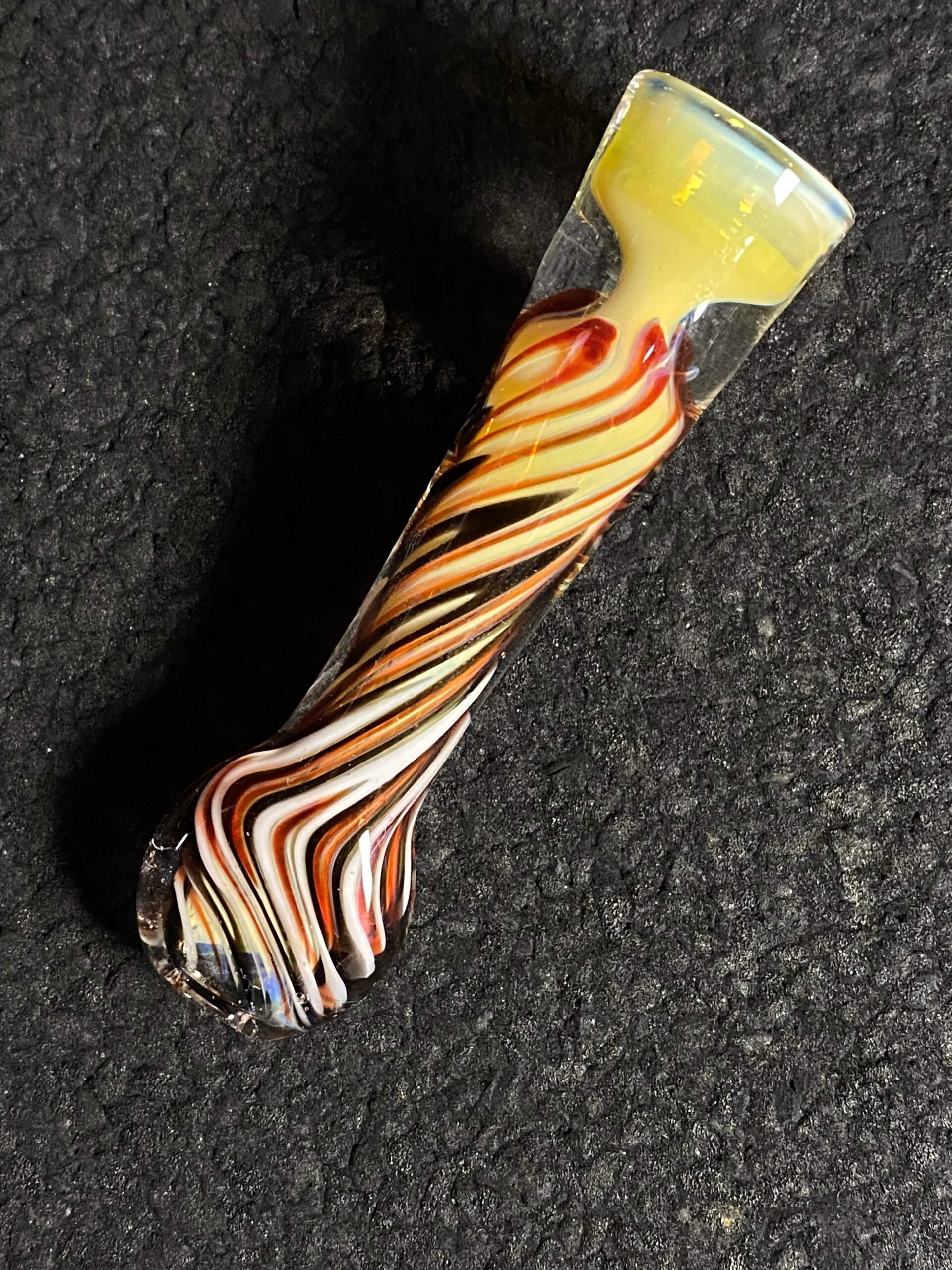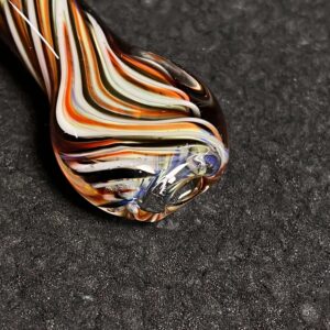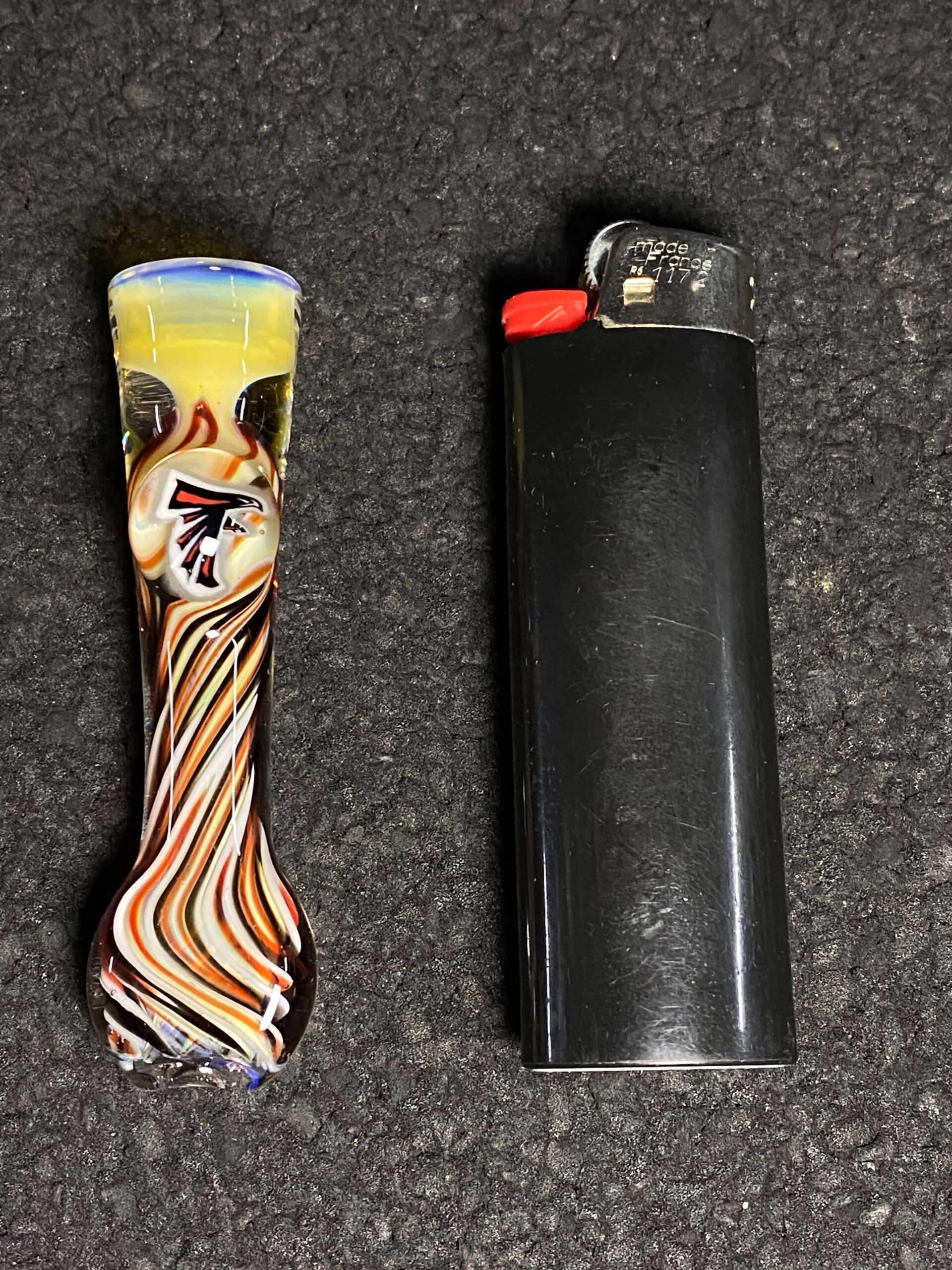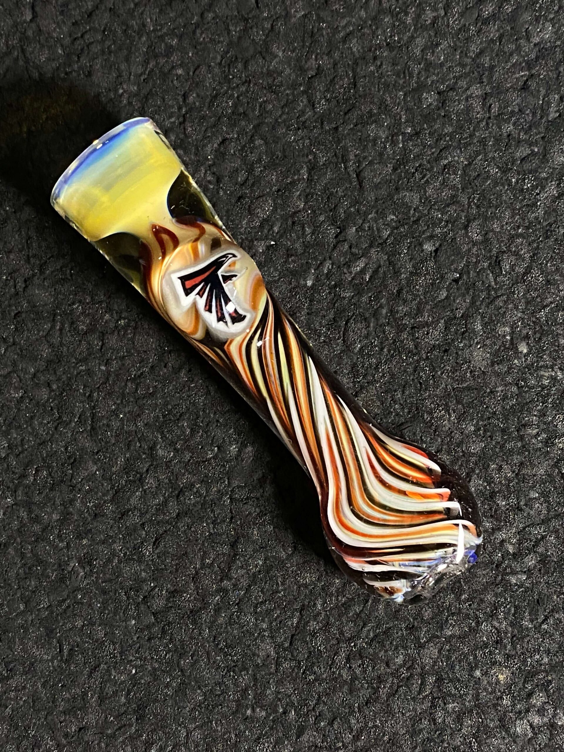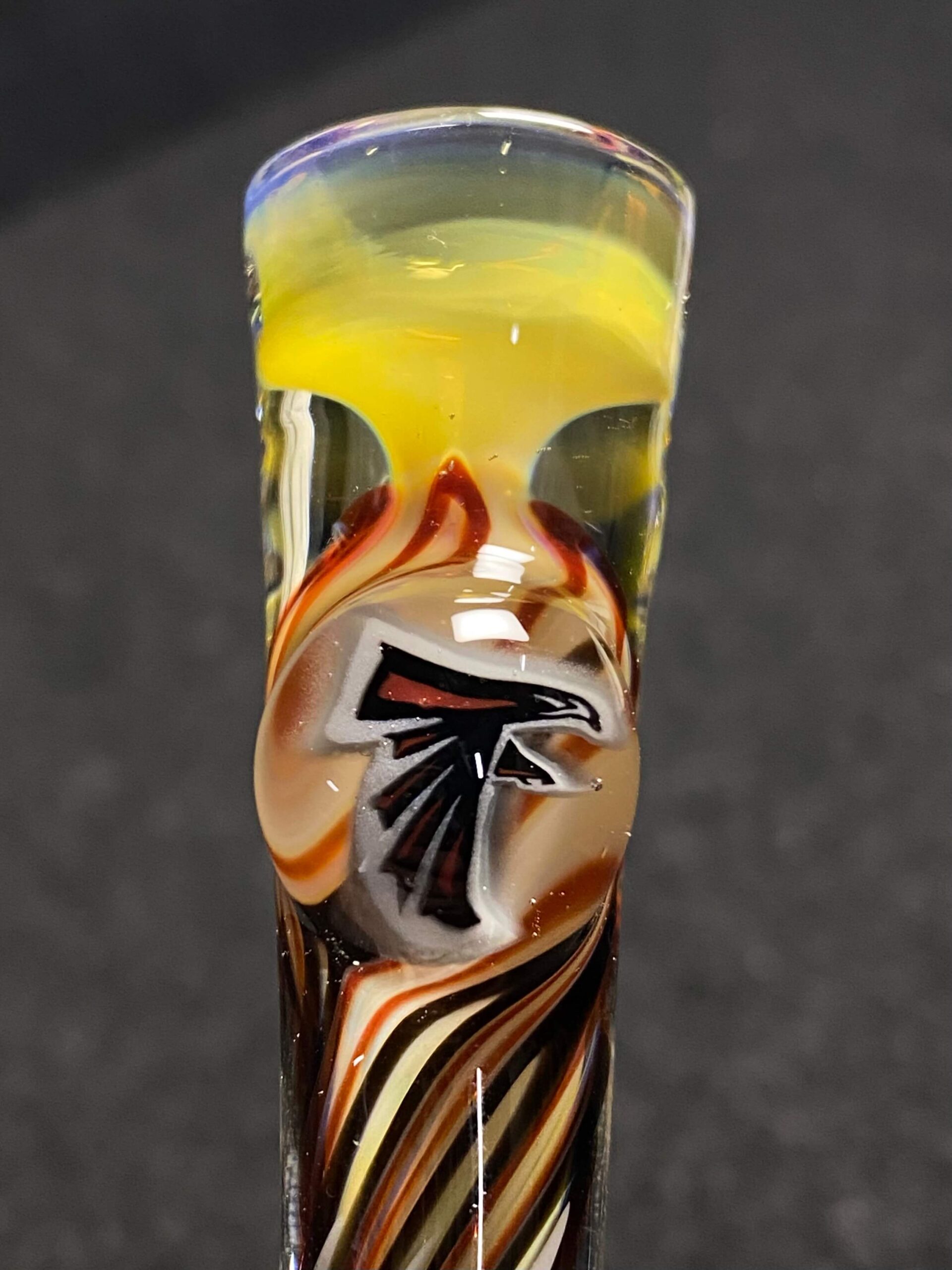 Atlanta Falcons hand blown glass tobacco chillum! Features red, white and black highlights; fumed with 99.9 pure silver for color changing effects; custom made Falcons millefiore; flat mouthpiece for hands free use; generous bowl; great for tailgating or a concert; all 32 teams available