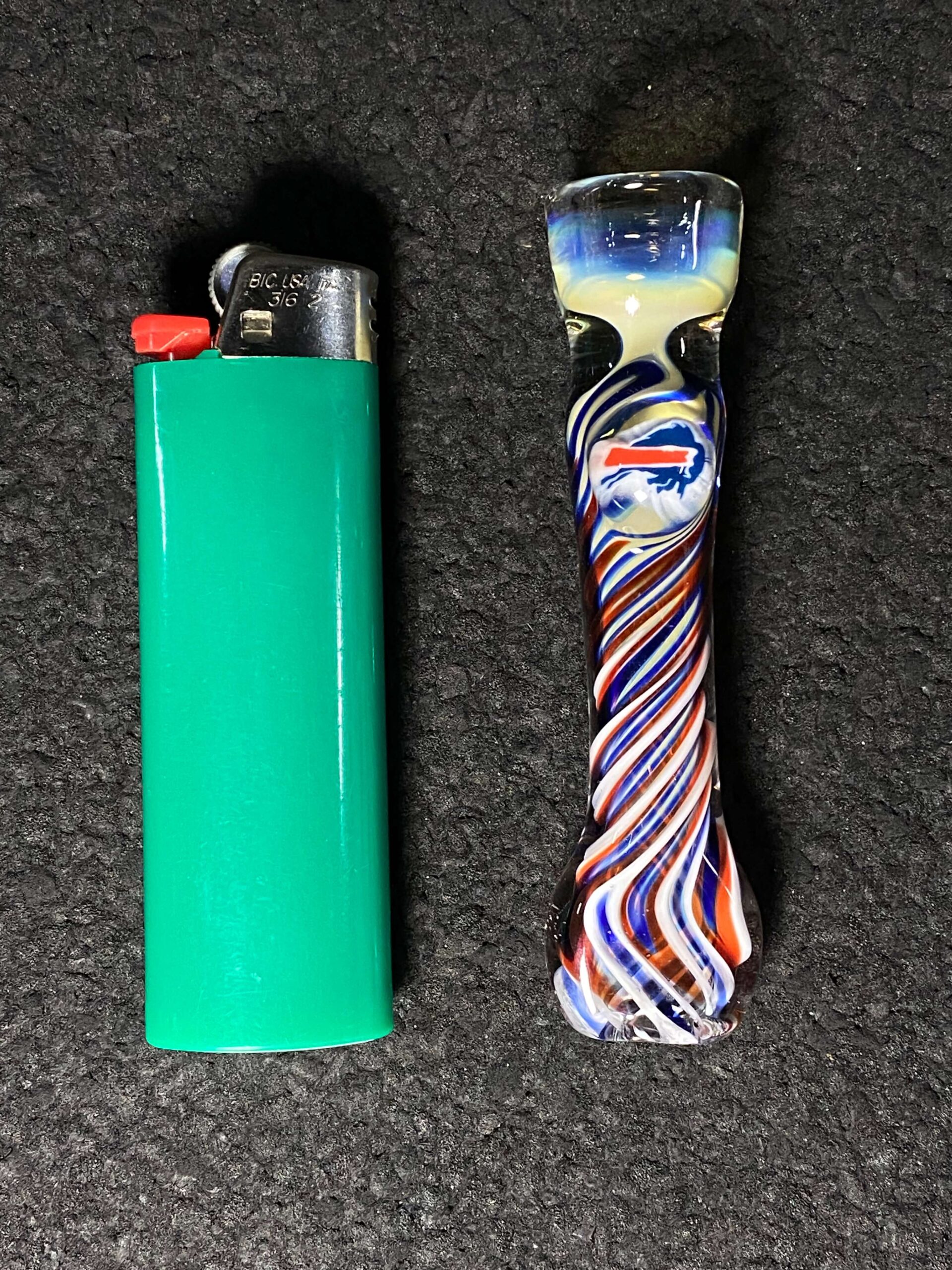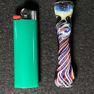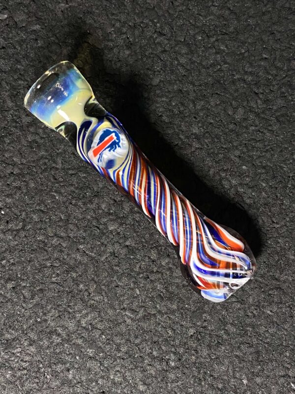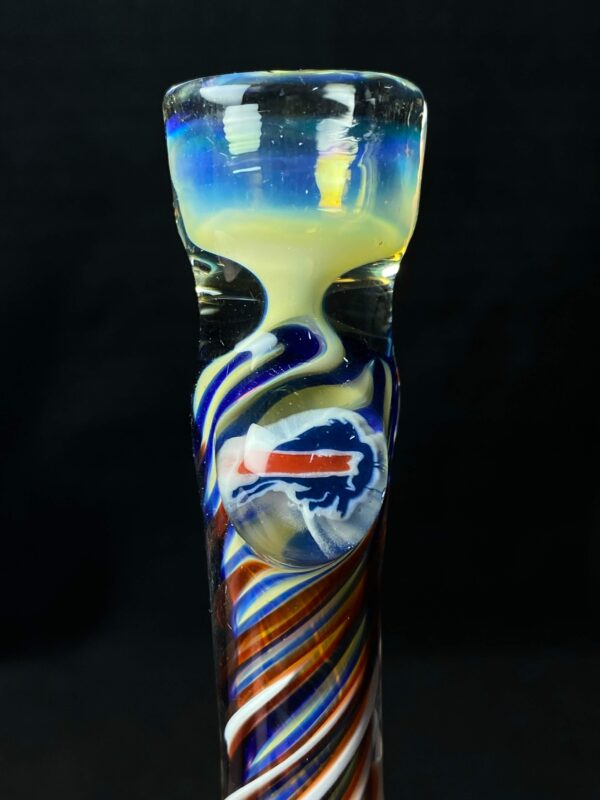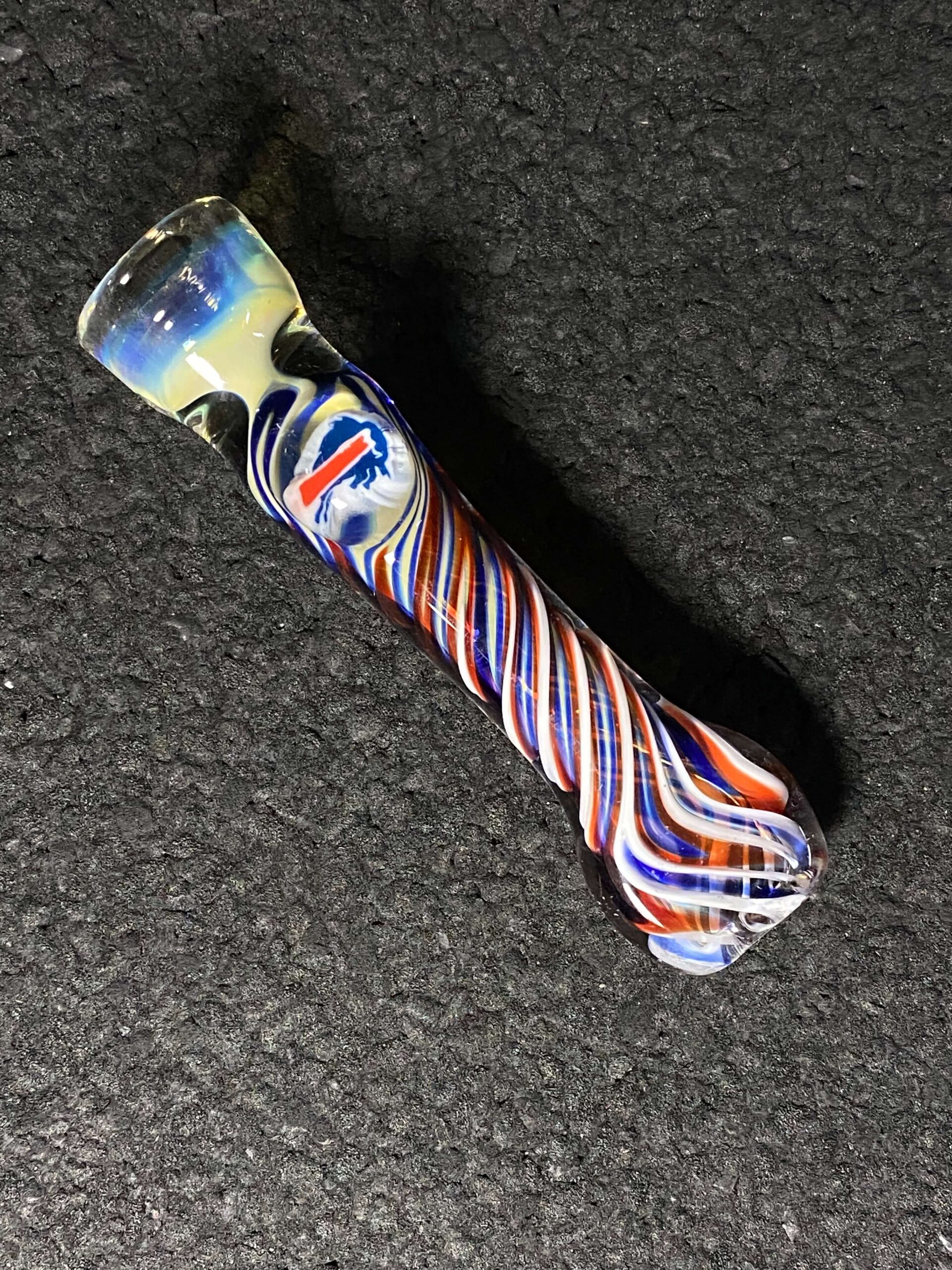 Buffalo Bills hand blown glass tobacco chillum! Features blue, white and red highlights; fumed with 99.9 pure silver for color changing effects; custom made Bills millefiore; flat mouthpiece for hands free use; generous bowl; great for tailgating or a concert; all 32 teams available