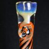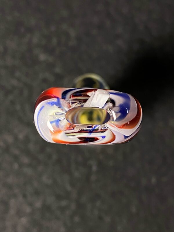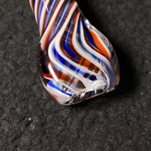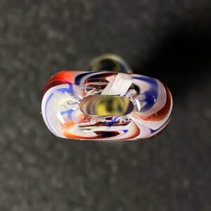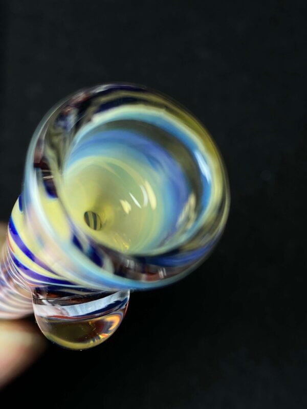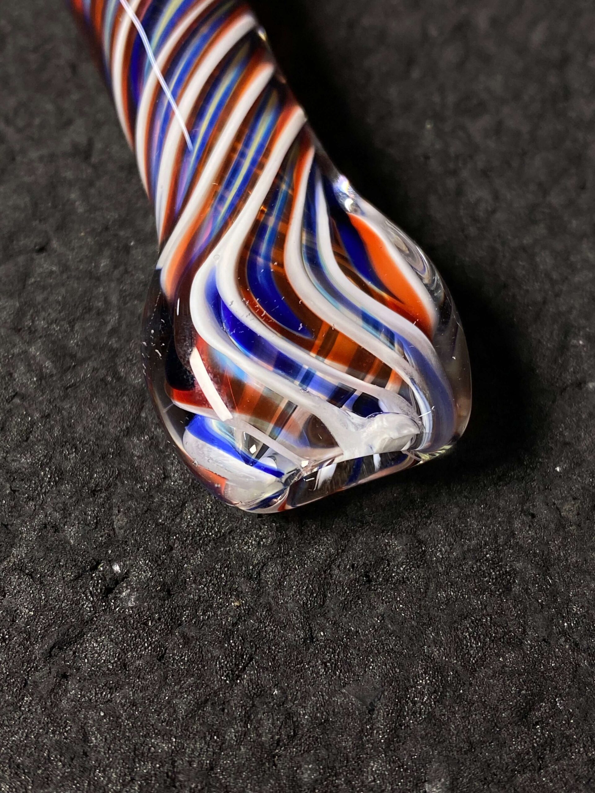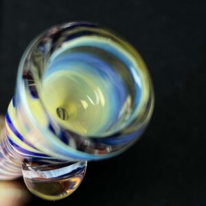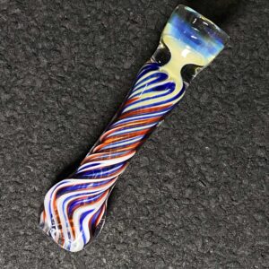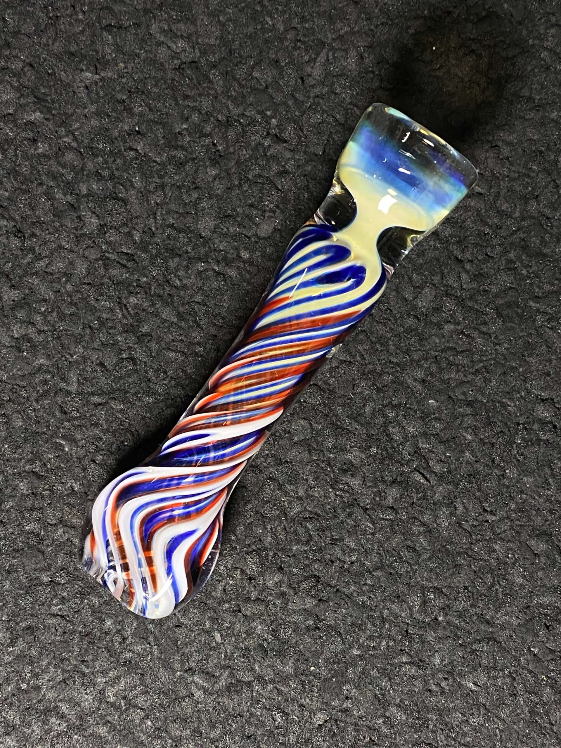 Buffalo Bills hand blown glass tobacco chillum! Features blue, white and red highlights; fumed with 99.9 pure silver for color changing effects; custom made Bills millefiore; flat mouthpiece for hands free use; generous bowl; great for tailgating or a concert; all 32 teams available