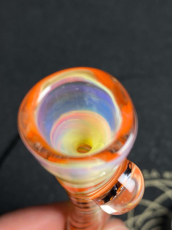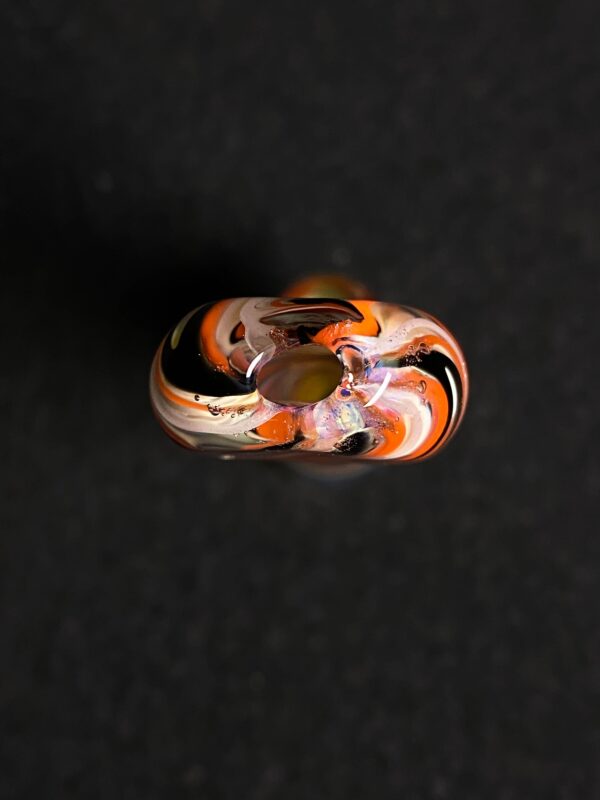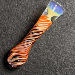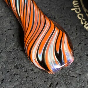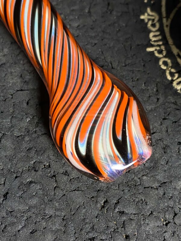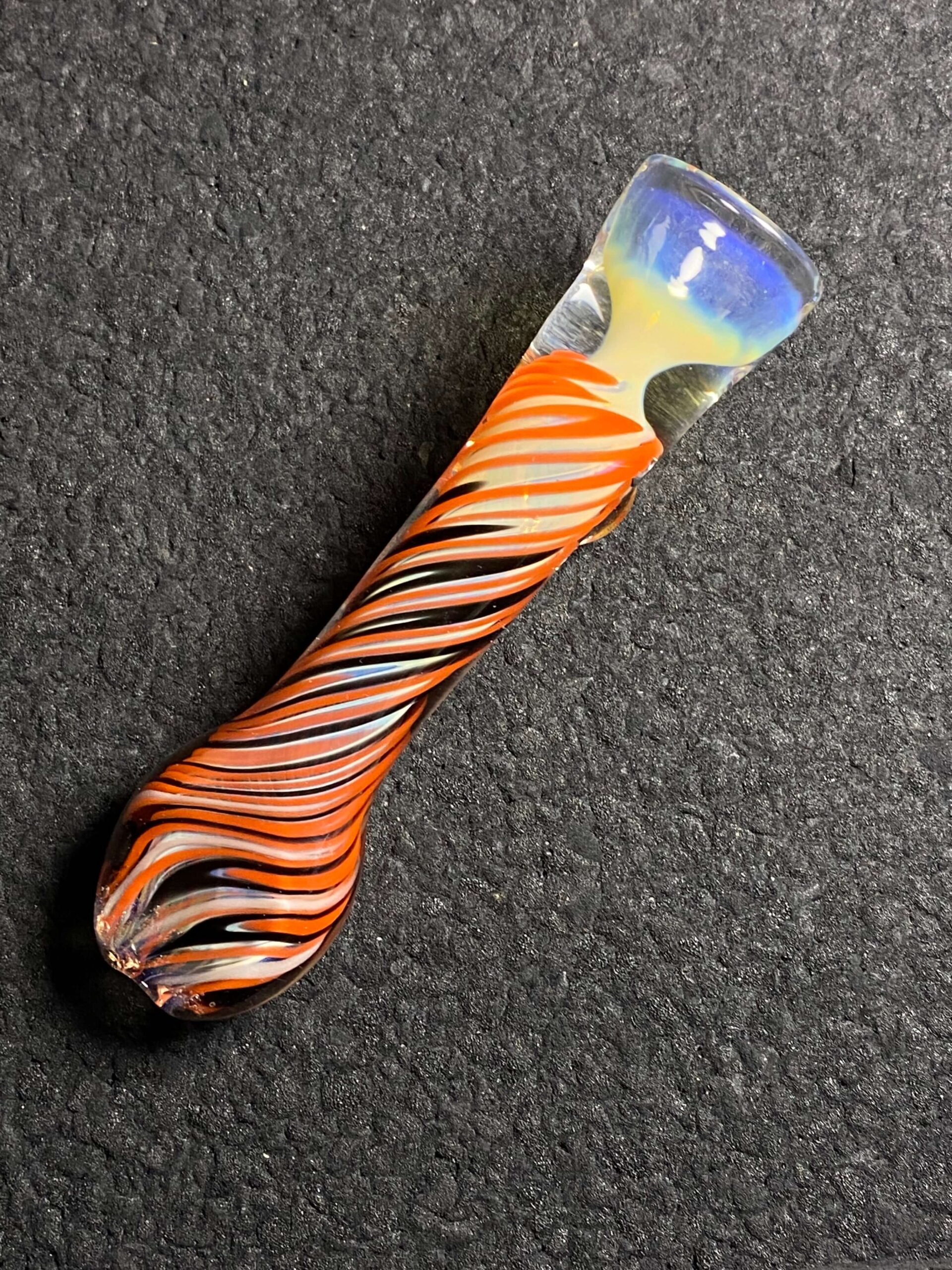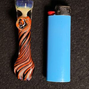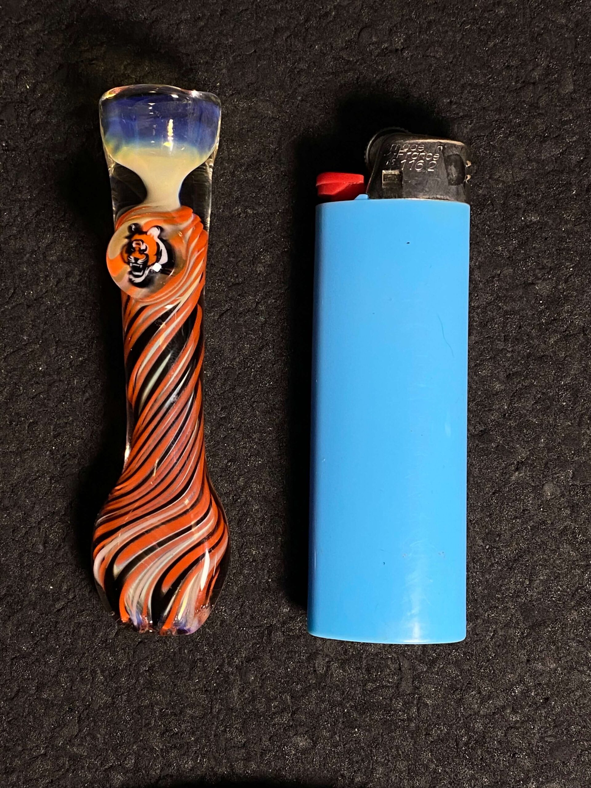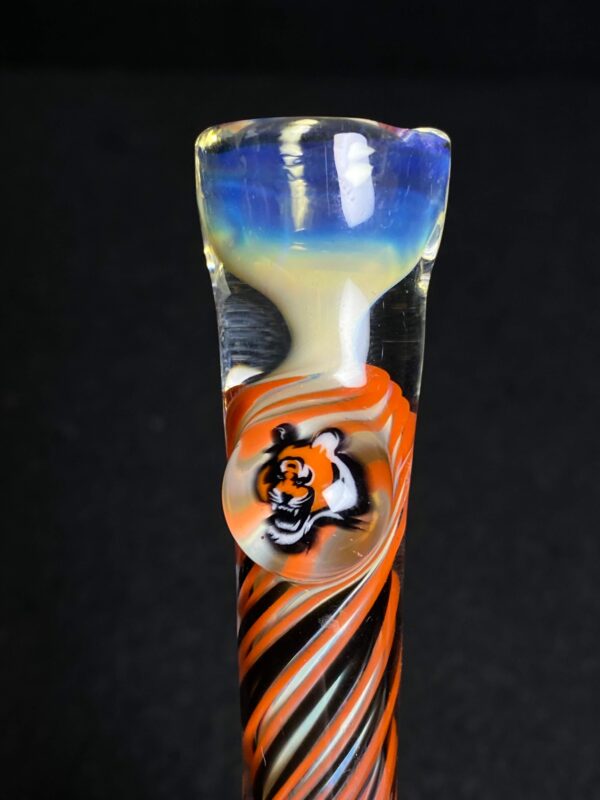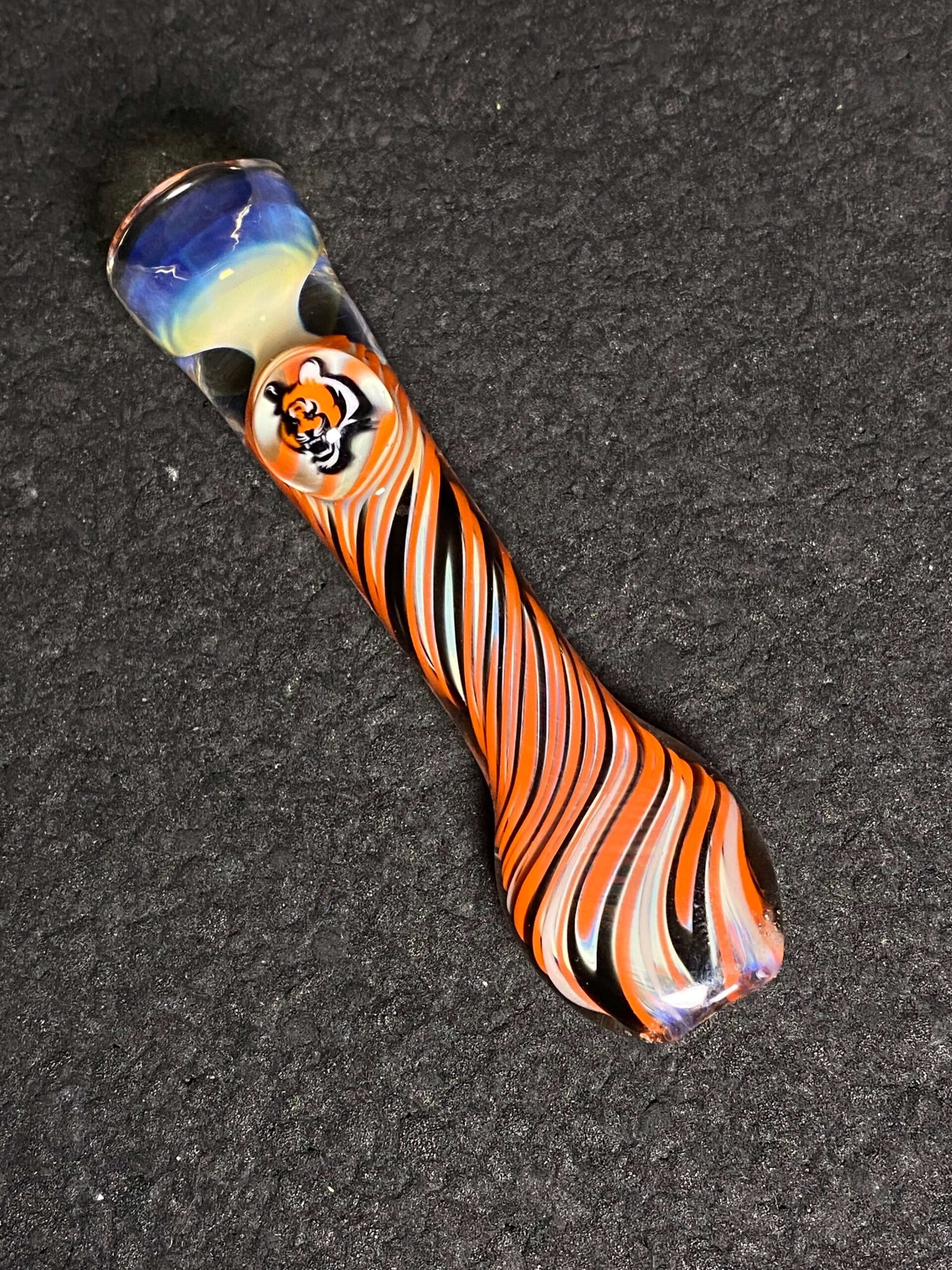 Cincinnati Bengals hand blown glass tobacco chillum! Features orange, white and black highlights; fumed with 99.9 pure silver for color changing effects; custom made Bengals millefiore; flat mouthpiece for hands free use; generous bowl; great for tailgating or a concert; all 32 teams available
