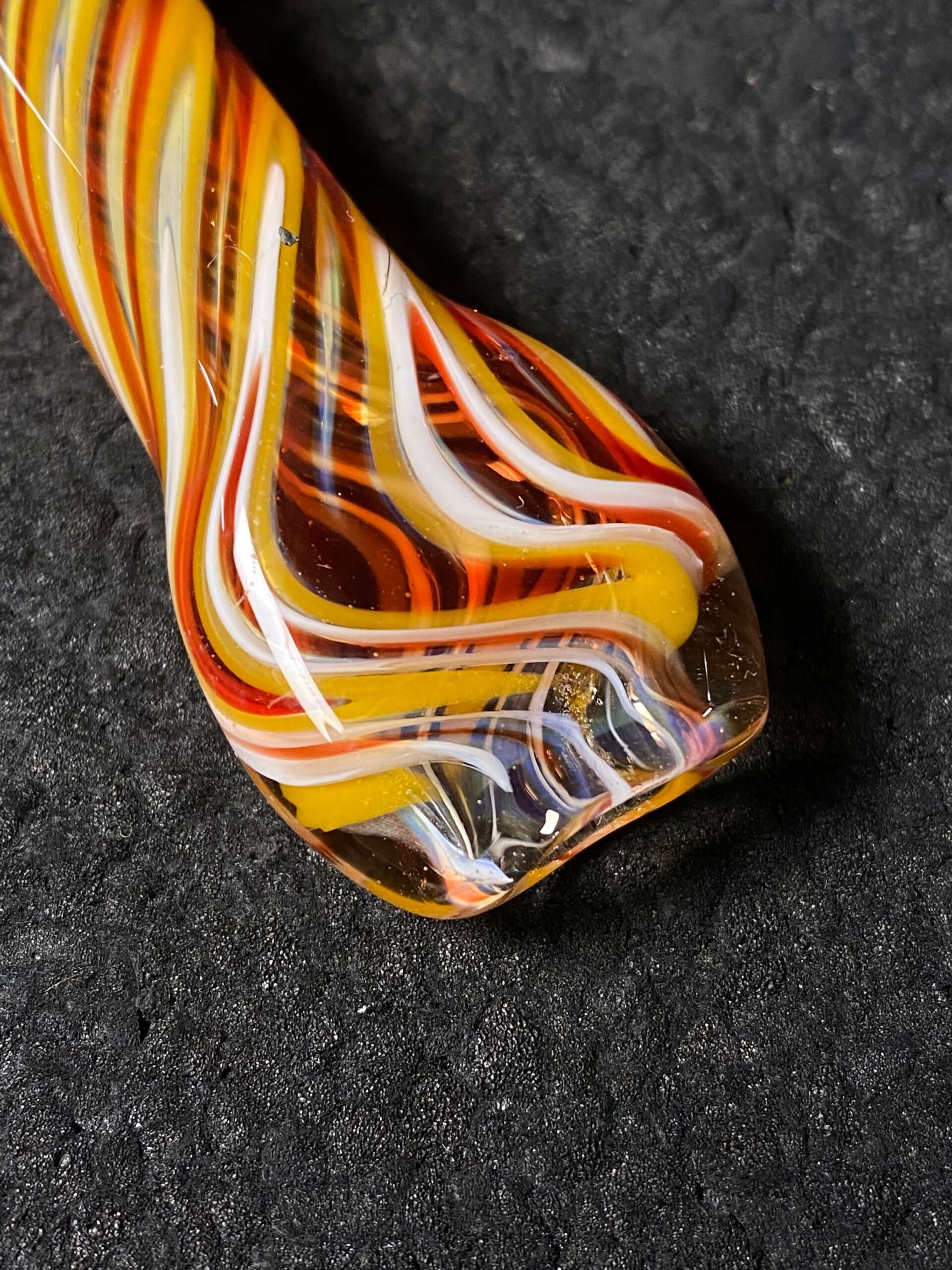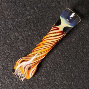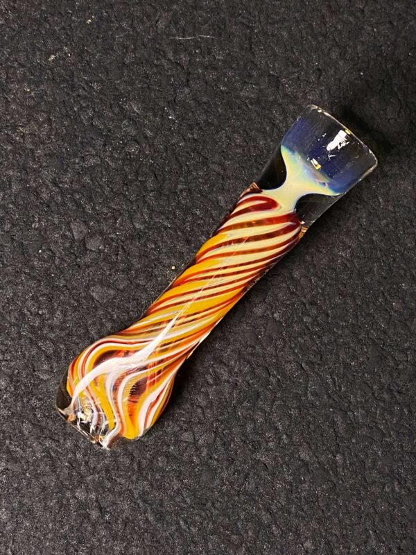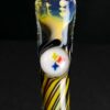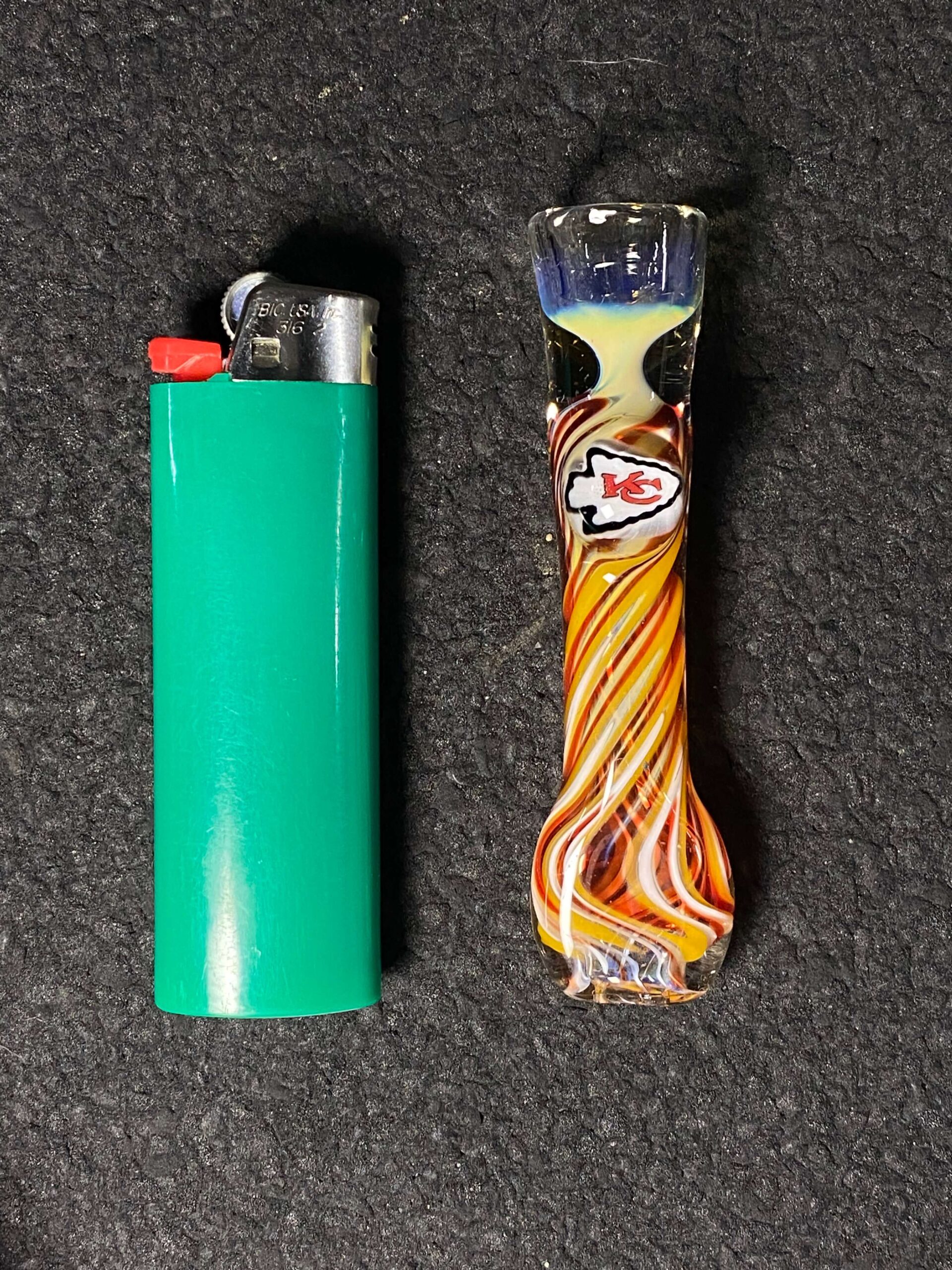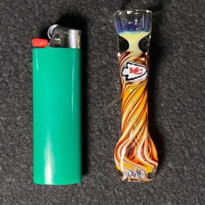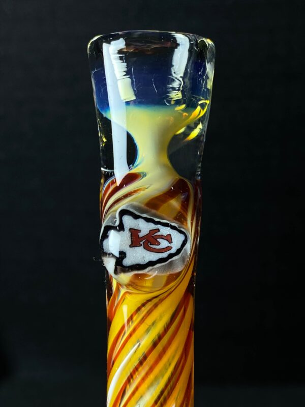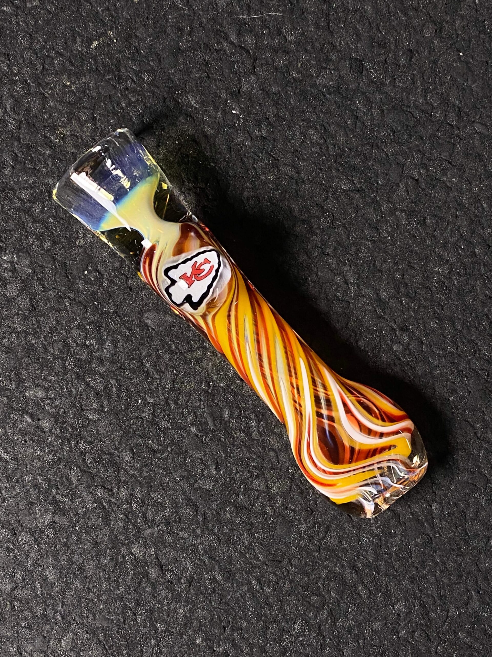 Kansas City Chiefs hand blown glass tobacco chillum! Features red and gold highlights; fumed with 99.9 pure silver for color changing effects; custom made Chiefs millefiore; flat mouthpiece for hands free use; generous bowl; great for tailgating or a concert; all 32 teams available