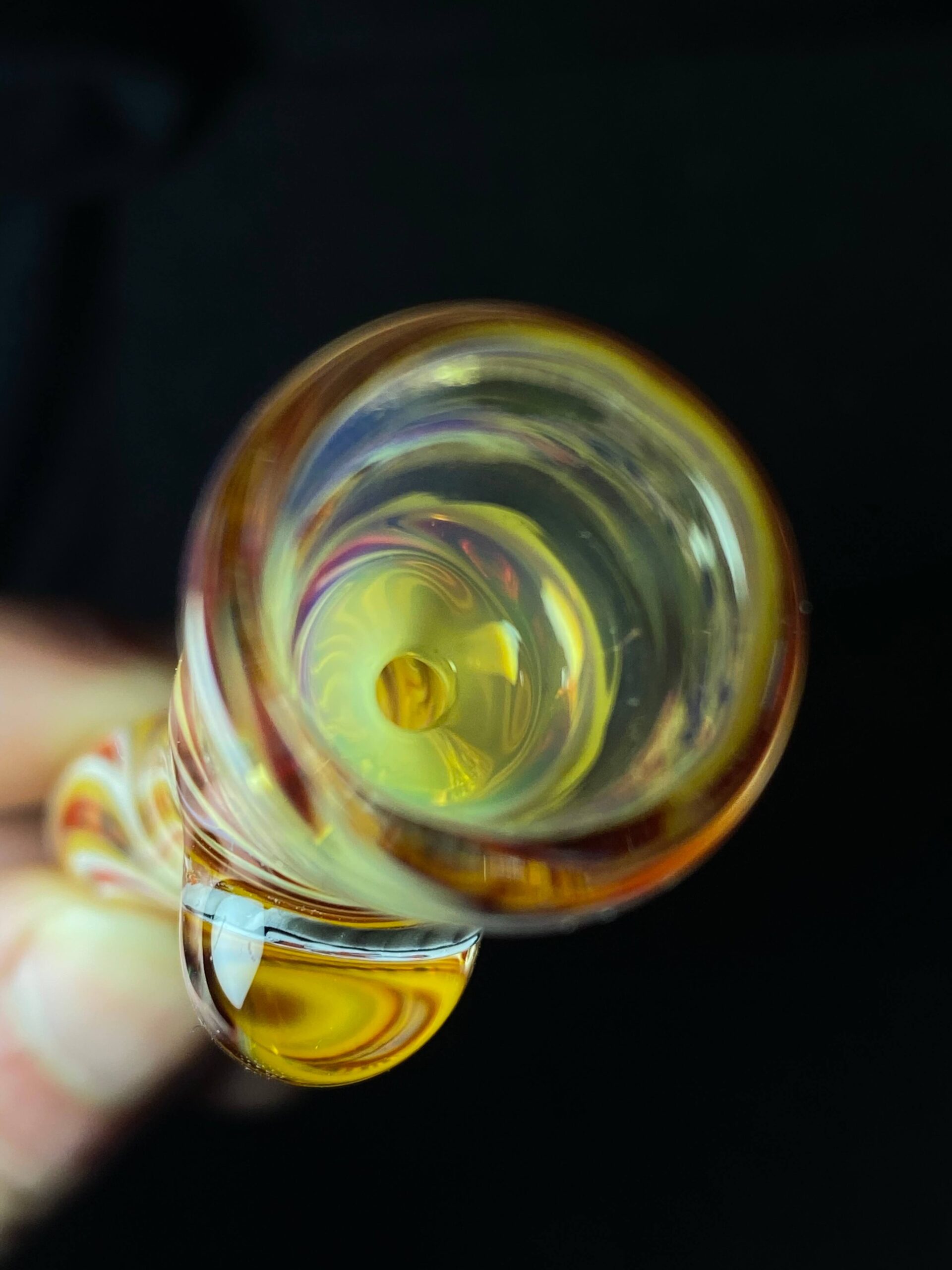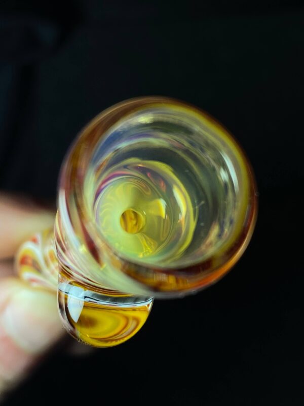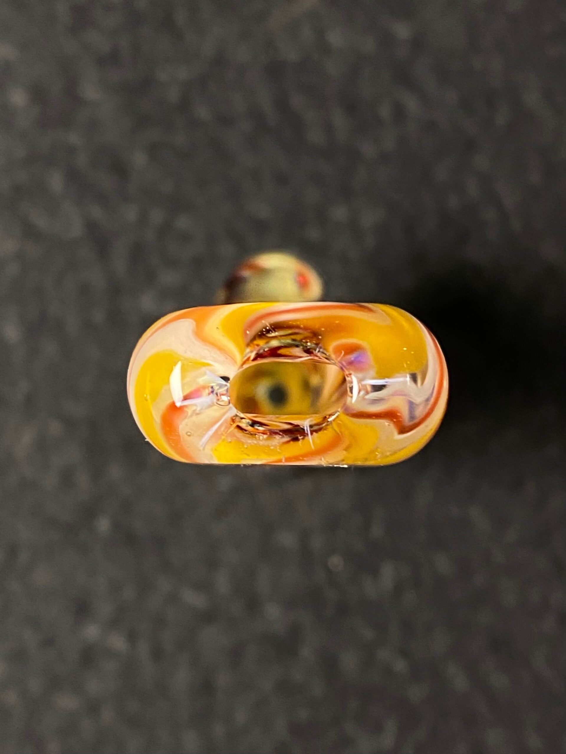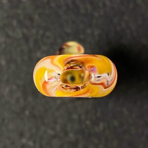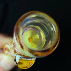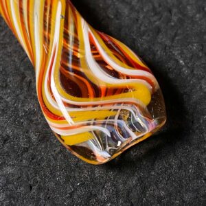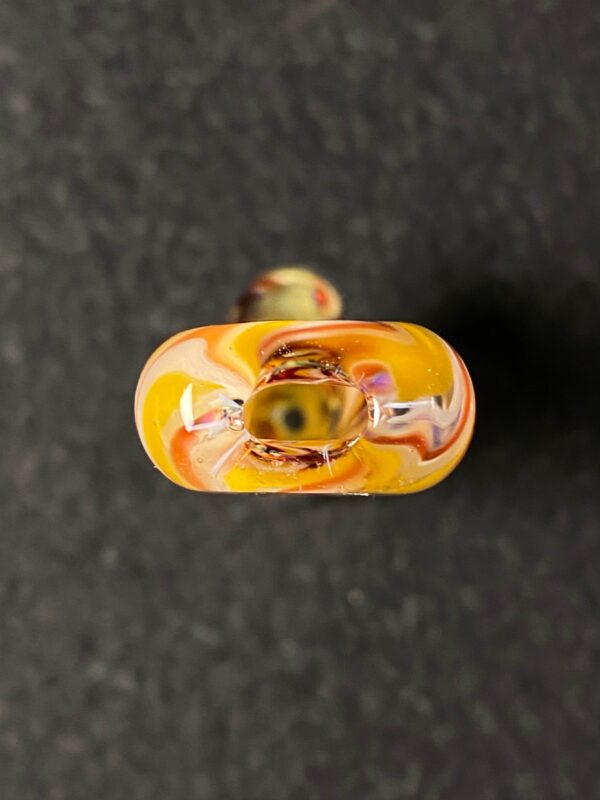 Kansas City Chiefs hand blown glass tobacco chillum! Features red and gold highlights; fumed with 99.9 pure silver for color changing effects; custom made Chiefs millefiore; flat mouthpiece for hands free use; generous bowl; great for tailgating or a concert; all 32 teams available