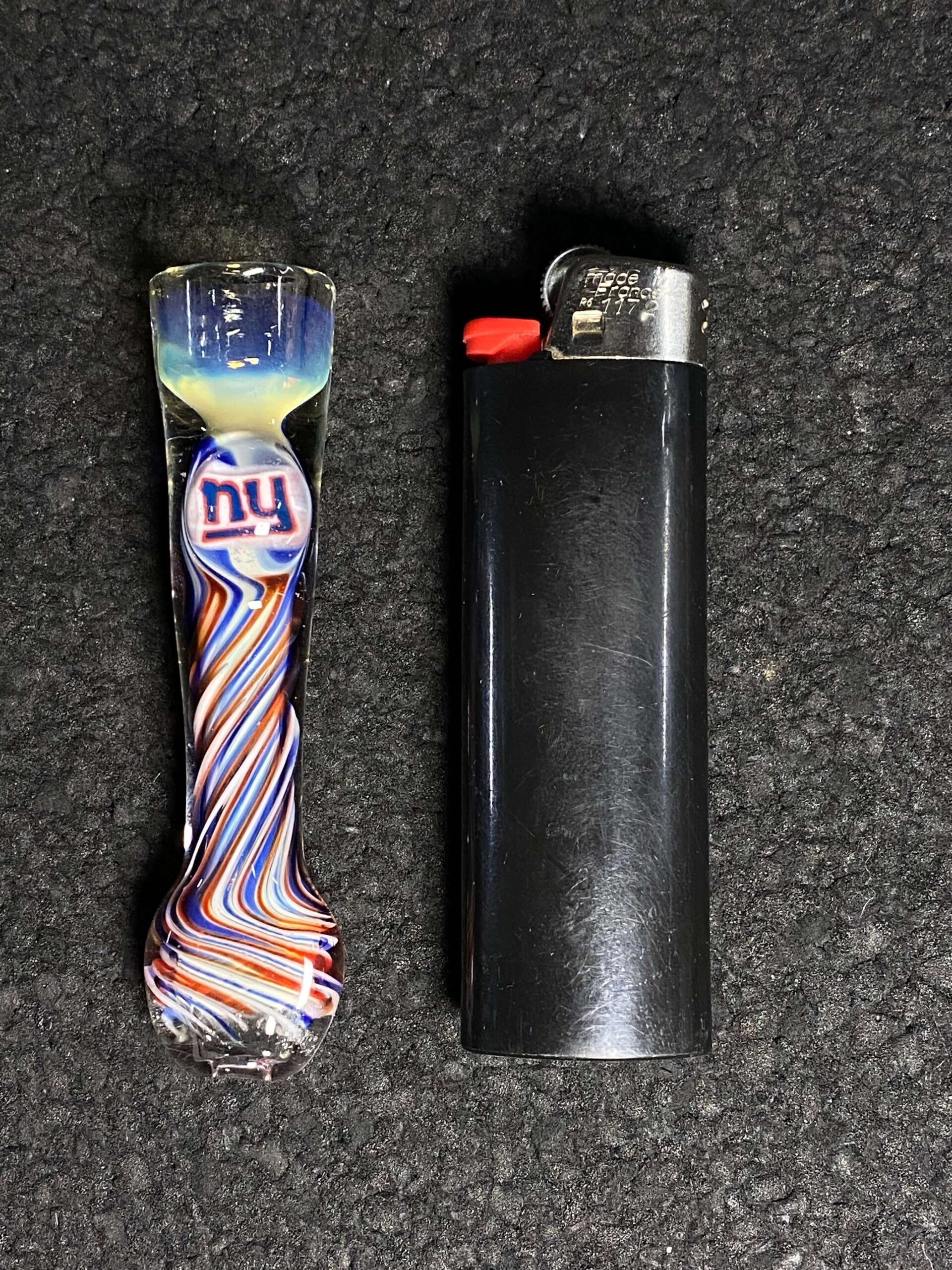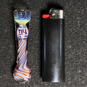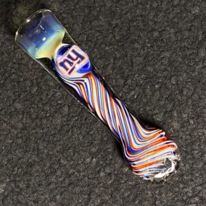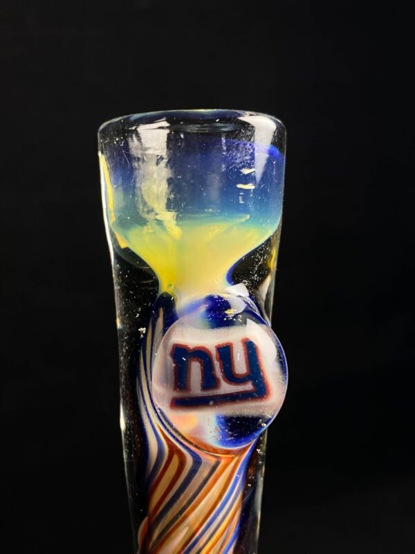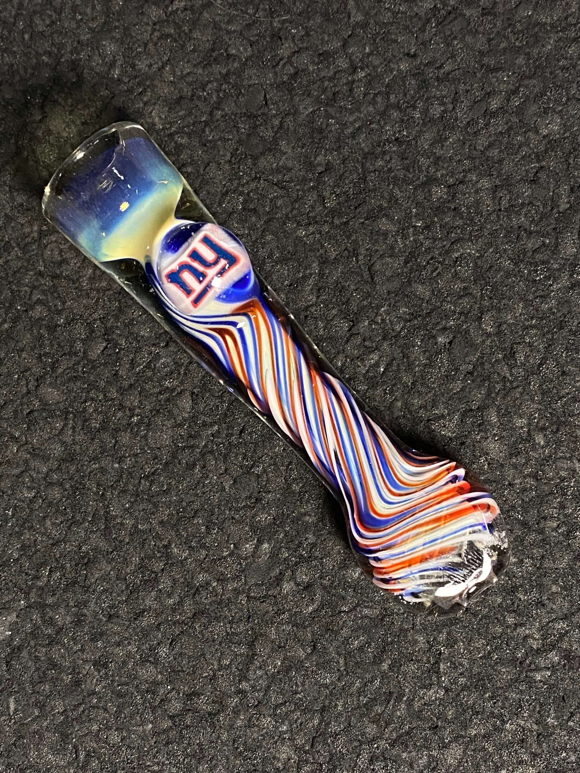 New York Giants hand blown glass tobacco chillum! Features blue and red highlights; fumed with 99.9 pure silver for color changing effects; custom made Giants millefiore; flat mouthpiece for hands free use; generous bowl; great for tailgating or a concert; all 32 teams available