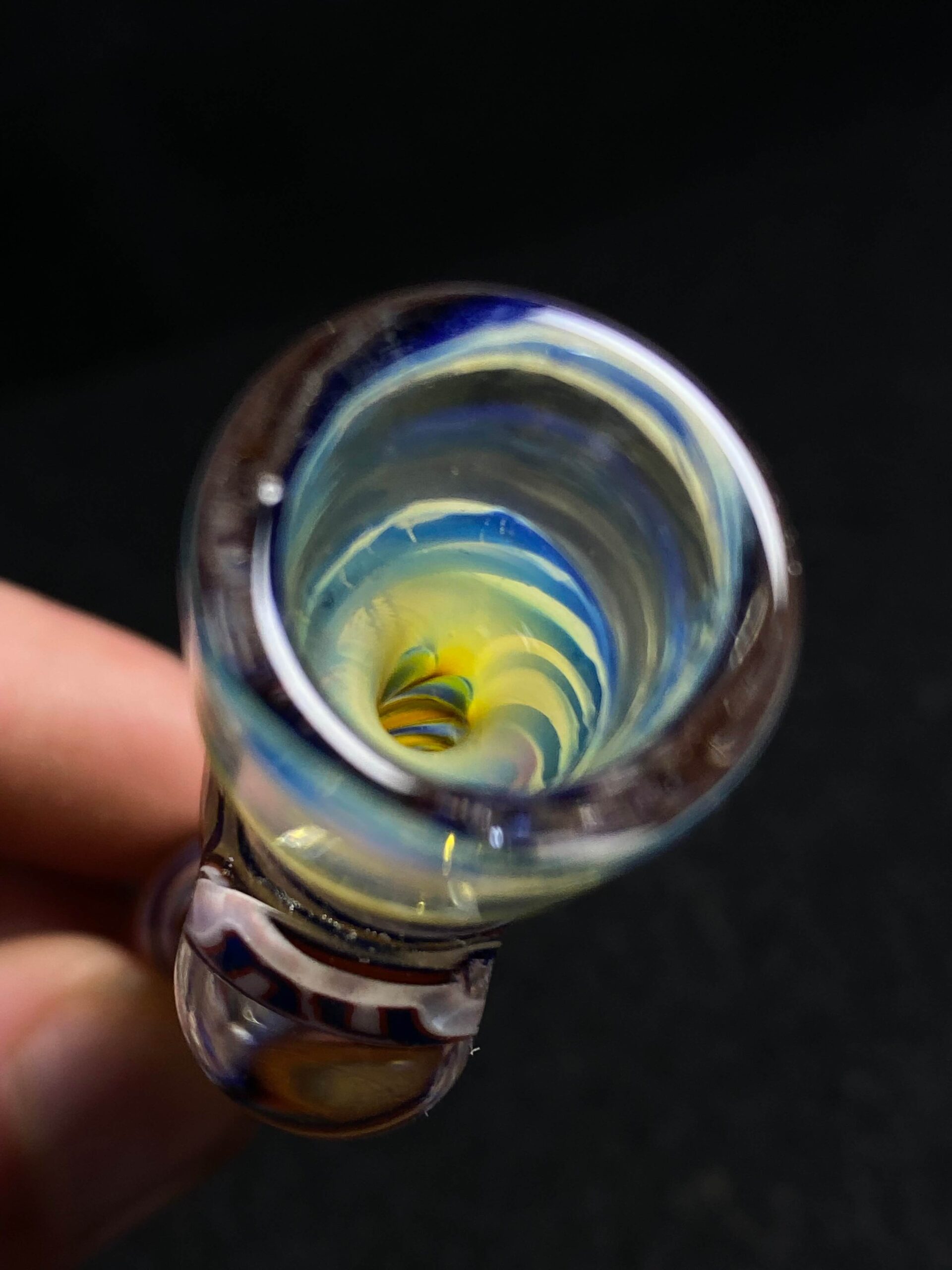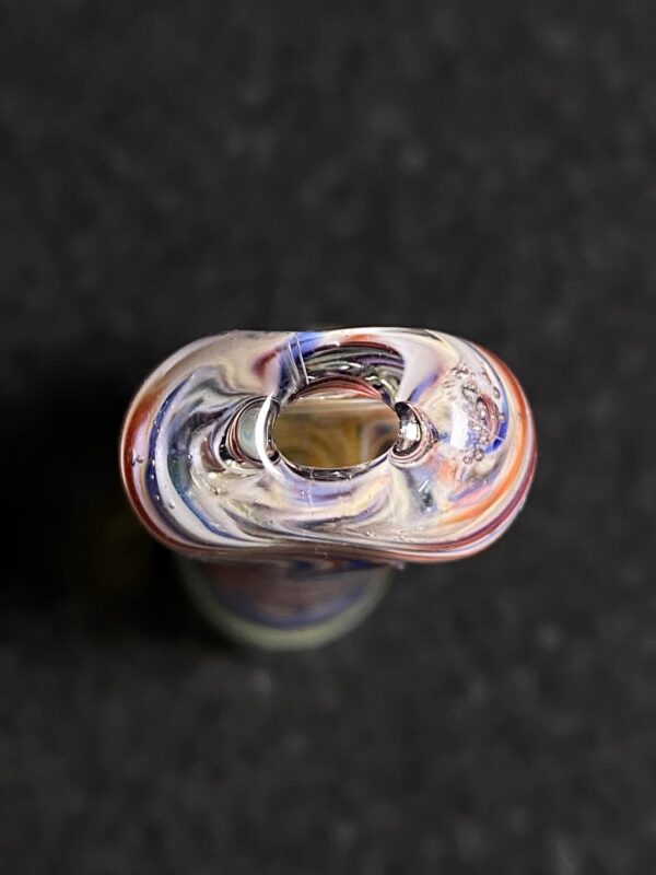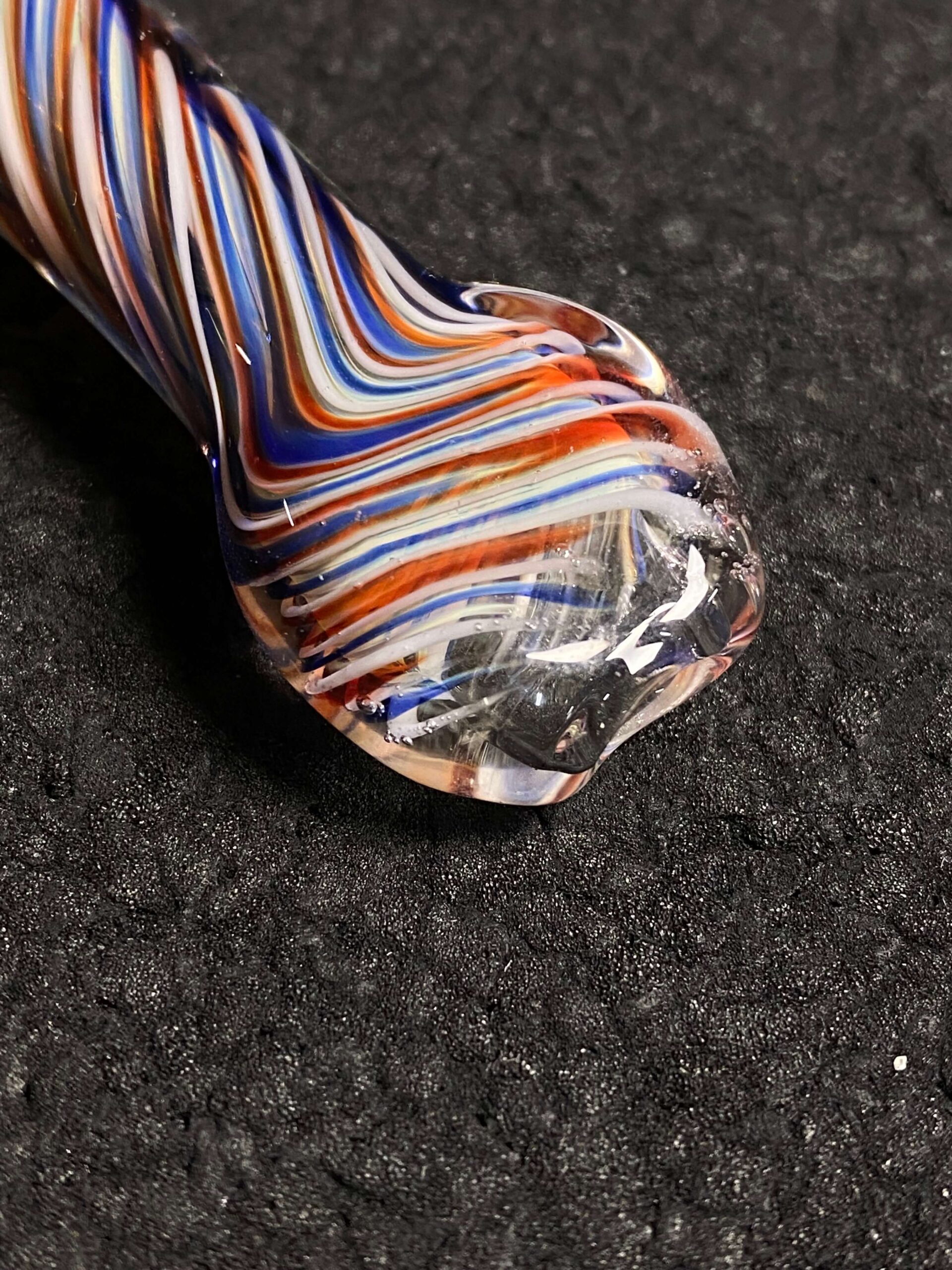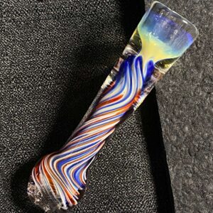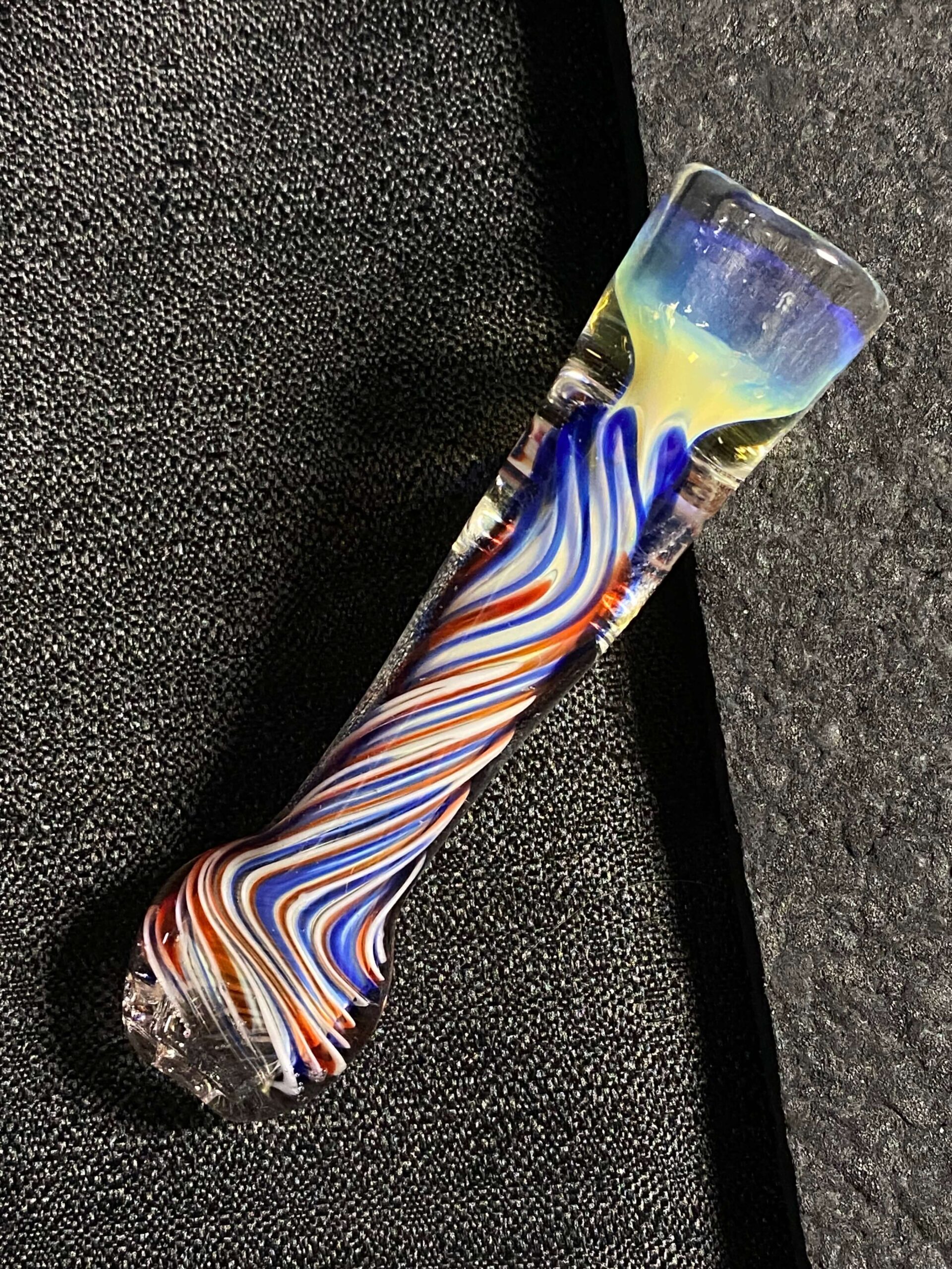 New York Giants hand blown glass tobacco chillum! Features blue and red highlights; fumed with 99.9 pure silver for color changing effects; custom made Giants millefiore; flat mouthpiece for hands free use; generous bowl; great for tailgating or a concert; all 32 teams available