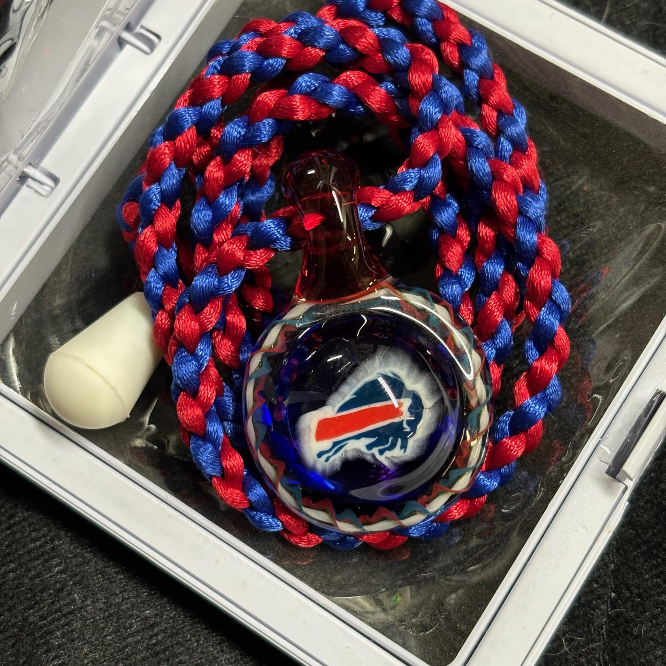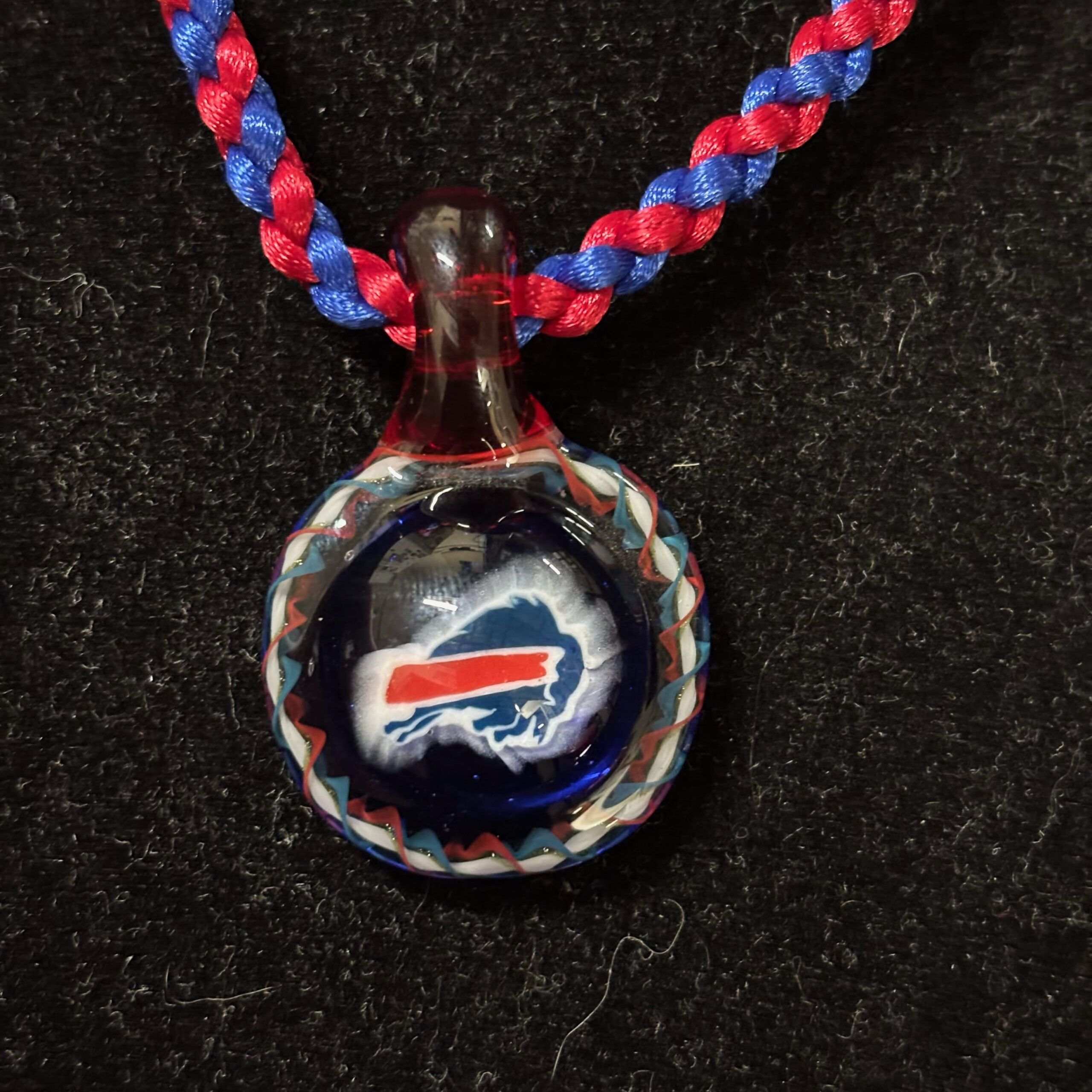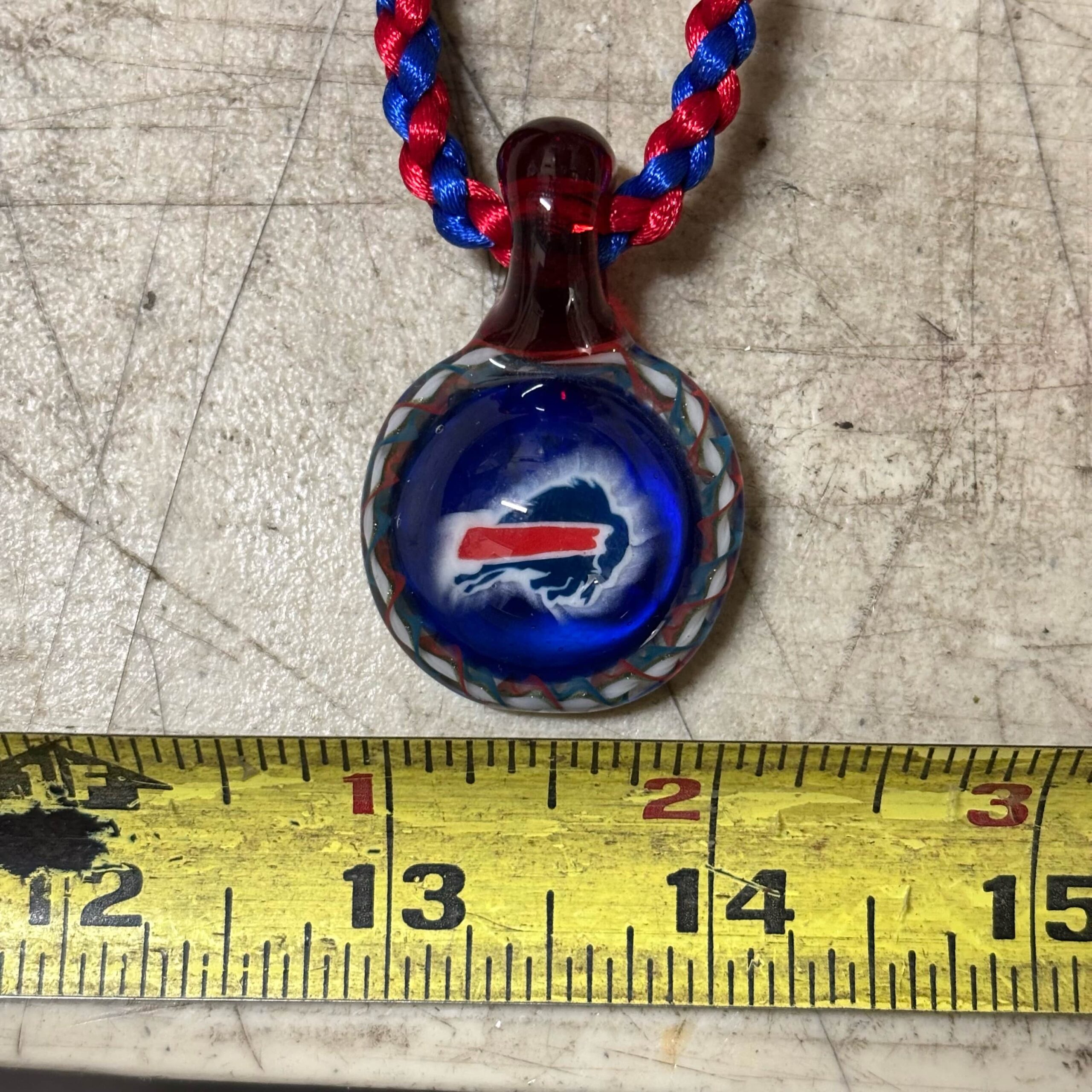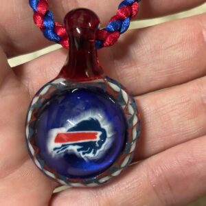 Buffalo Bills glass pendant and chain/necklace – Handmade in the USA featuring Buffalo Bills logo backed with blue framed in white twisty cane and strung up on a blue and red chain/necklace. Pendant size can vary from 1-1.5 inches although most are 1.25 inches in diameter