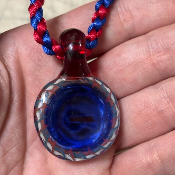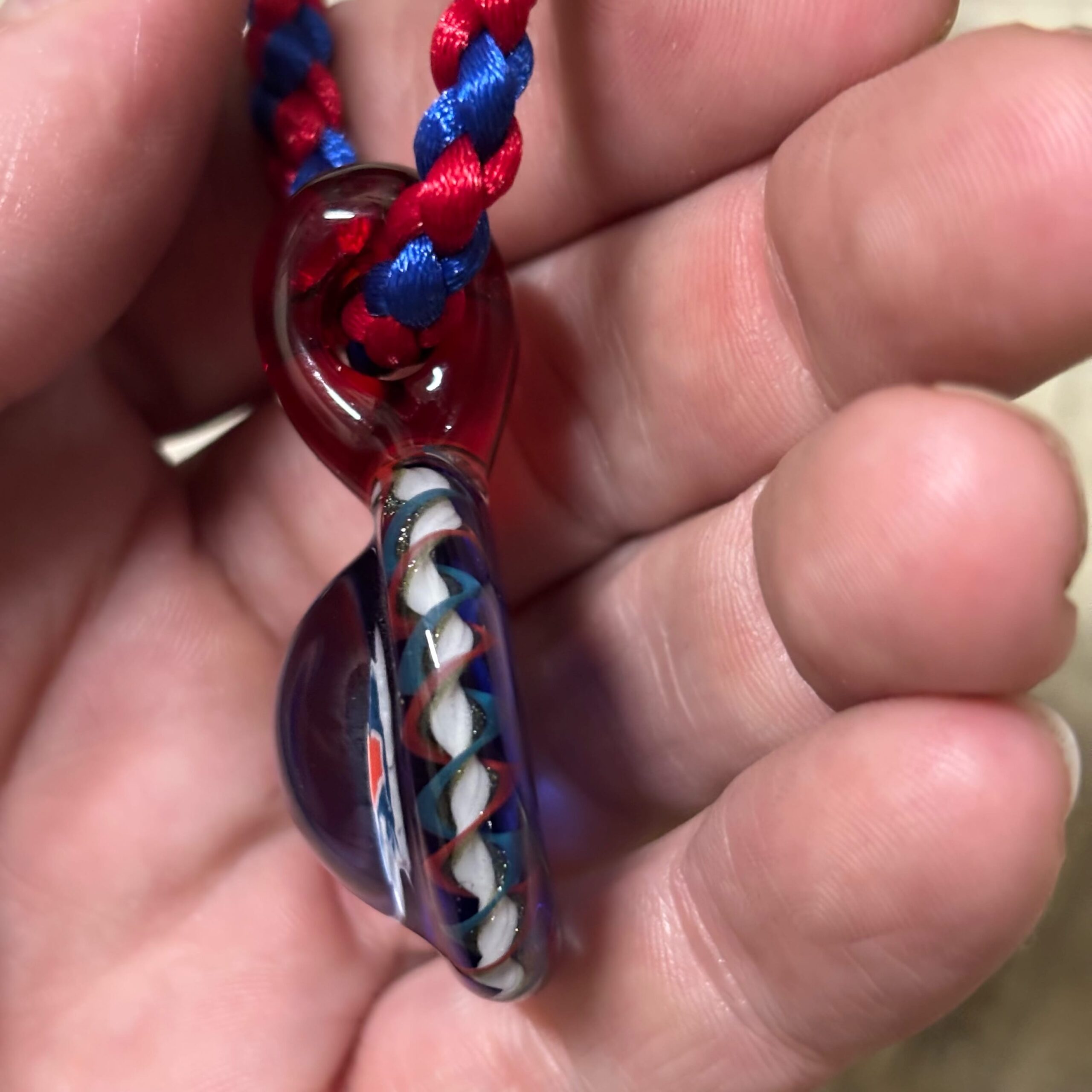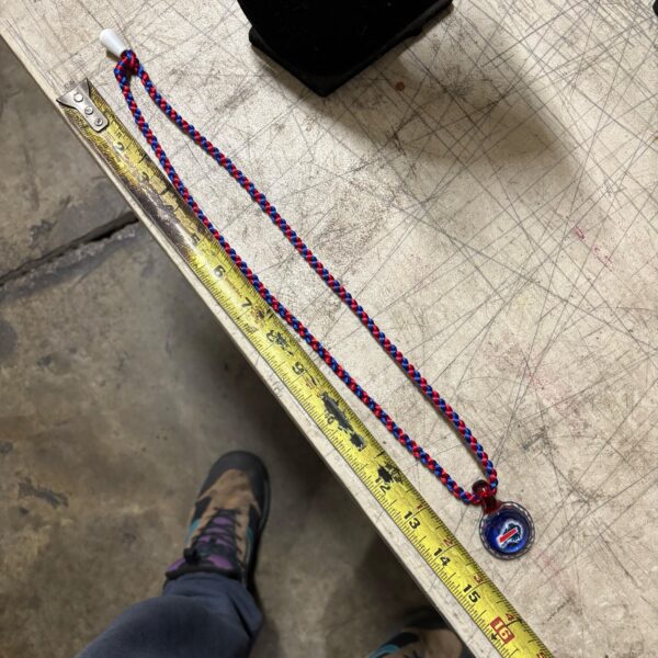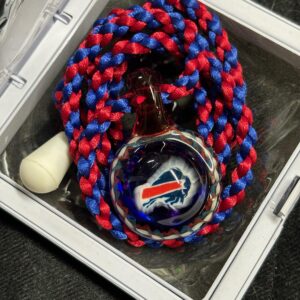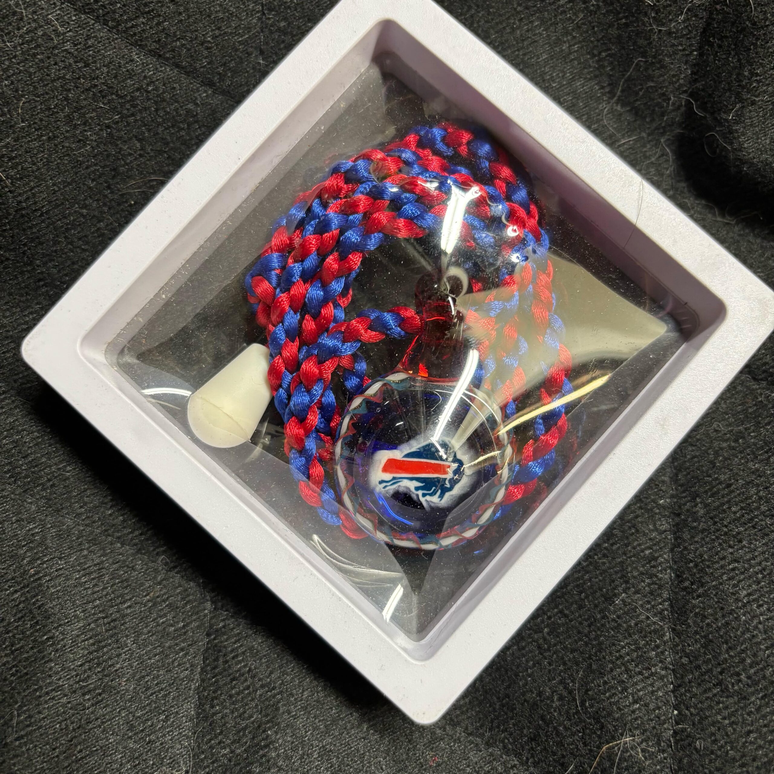 Buffalo Bills glass pendant and chain/necklace – Handmade in the USA featuring Buffalo Bills logo backed with blue framed in white twisty cane and strung up on a blue and red chain/necklace. Pendant size can vary from 1-1.5 inches although most are 1.25 inches in diameter