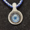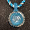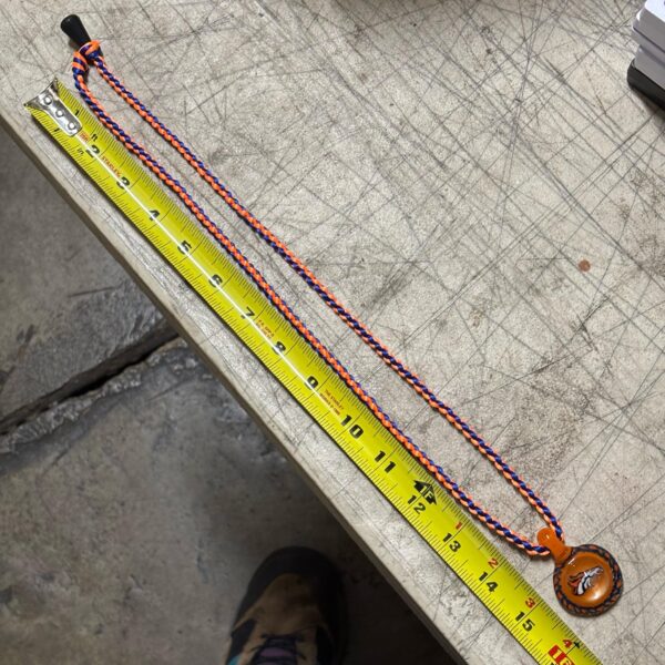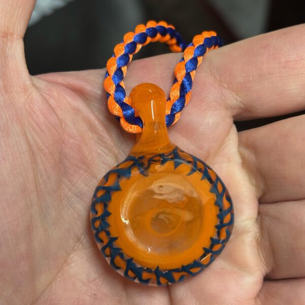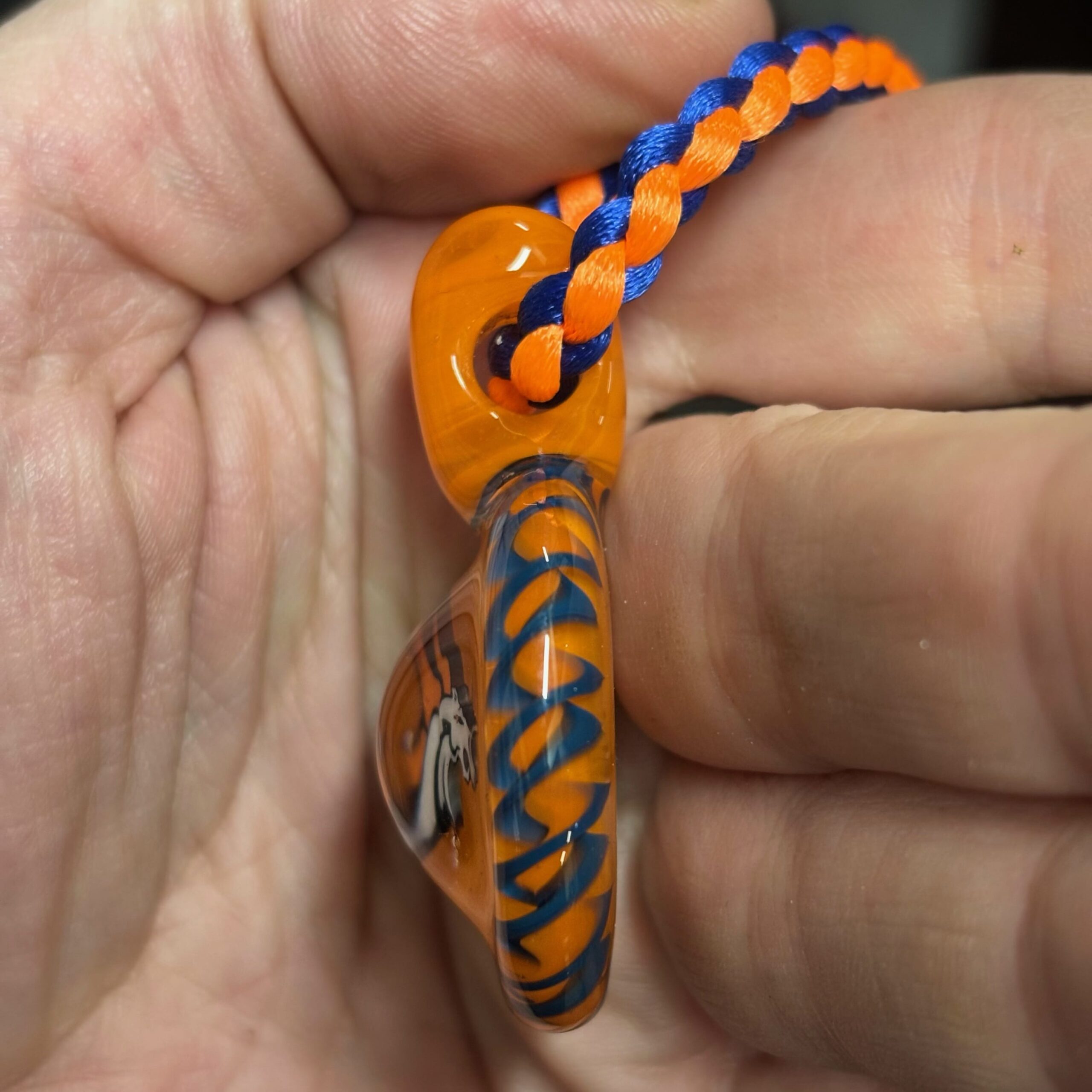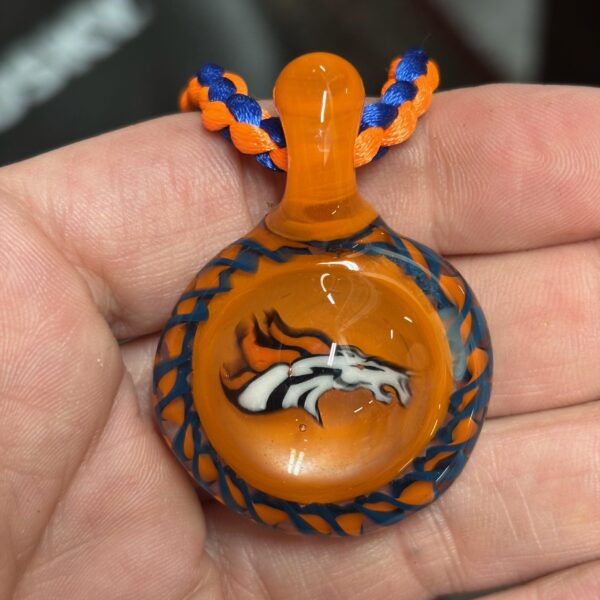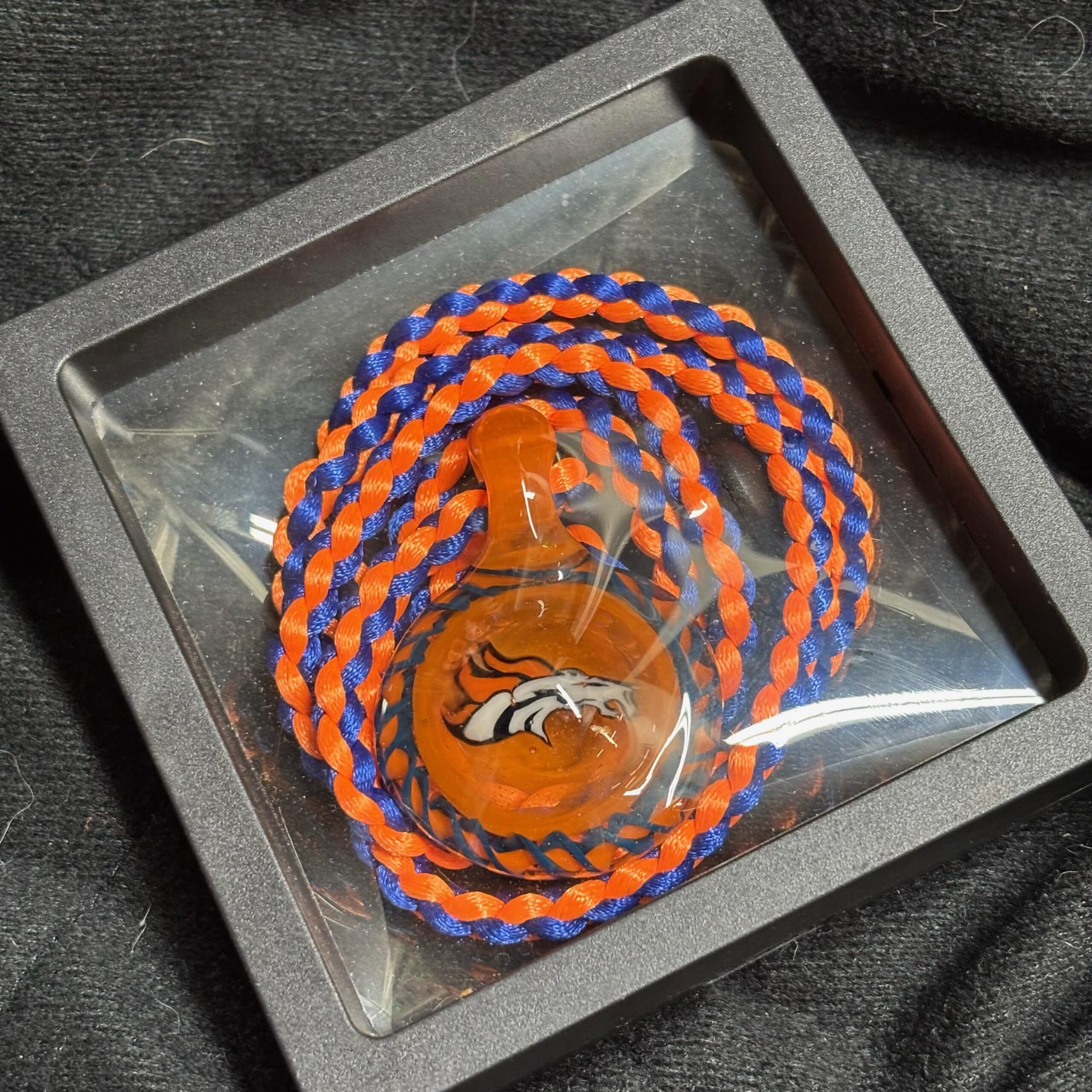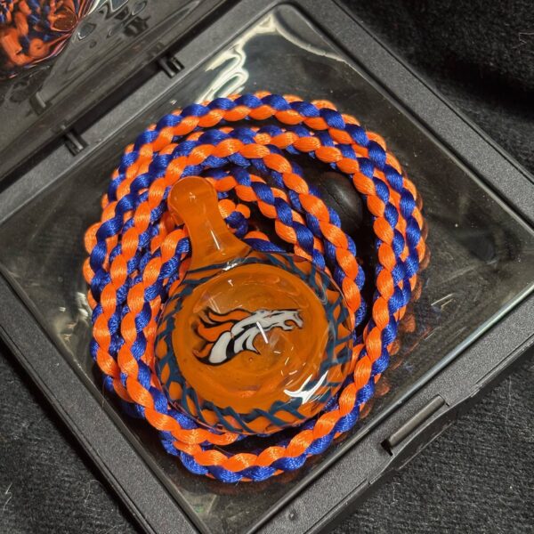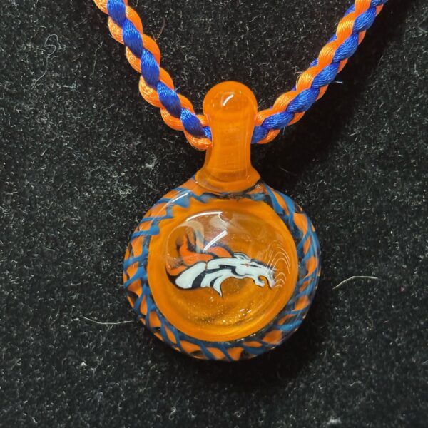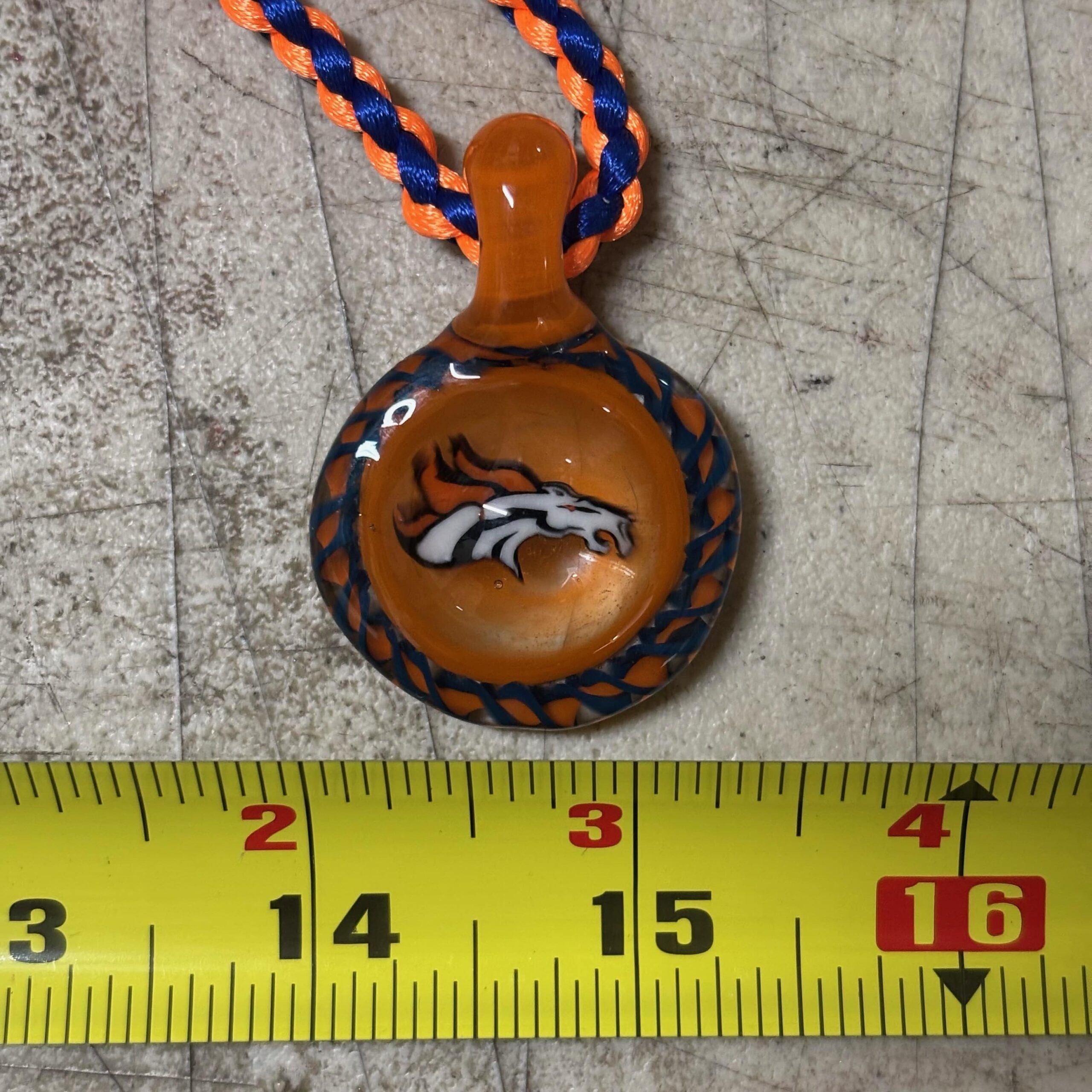Denver Broncos glass pendant and chain/necklace – Handmade in the USA featuring Denver Broncos logo backed with orange framed in blue and orange twisty cane and strung up on a blue and orange chain/necklace. Pendant size can vary from 1-1.5 inches although most are 1.25 inches in diameter
