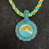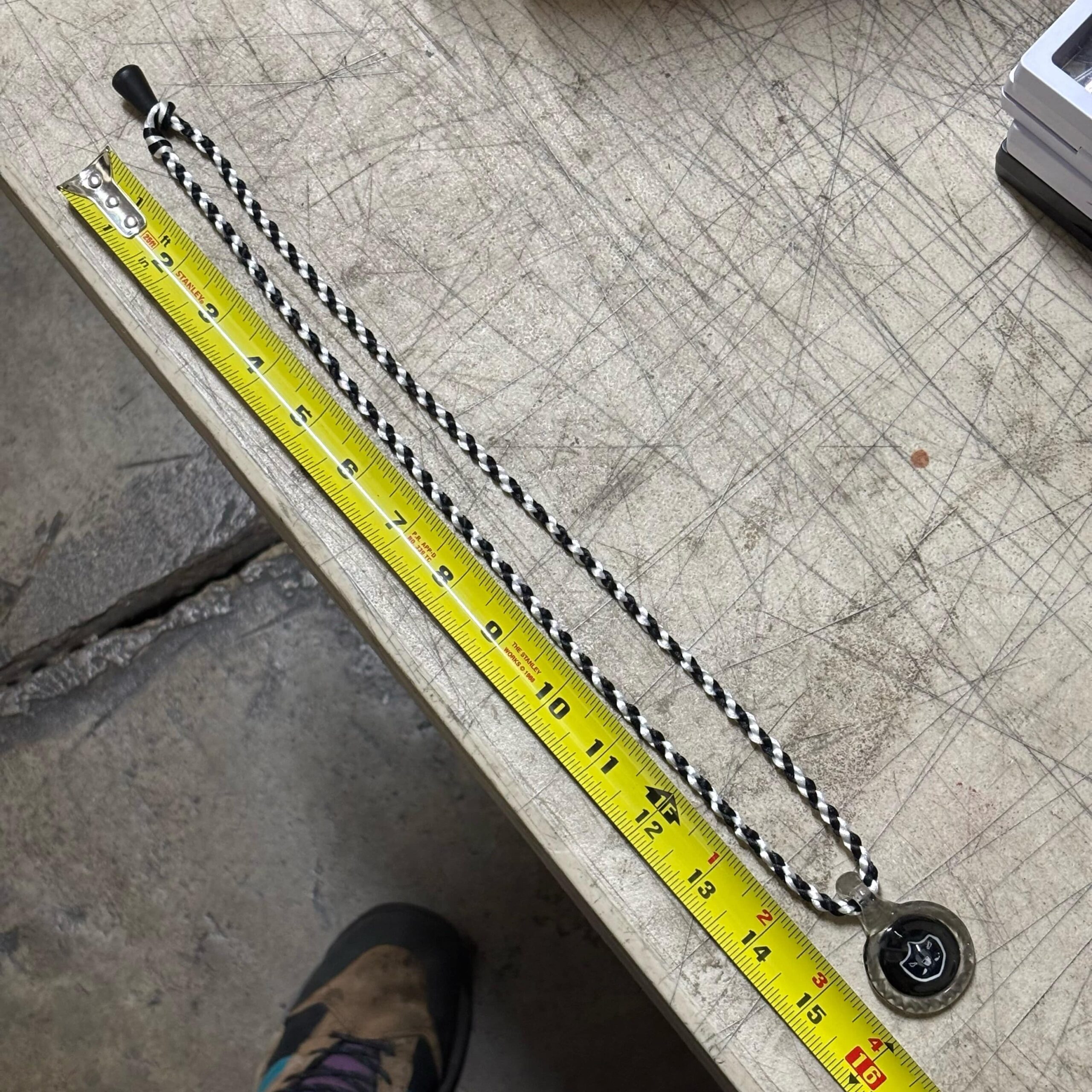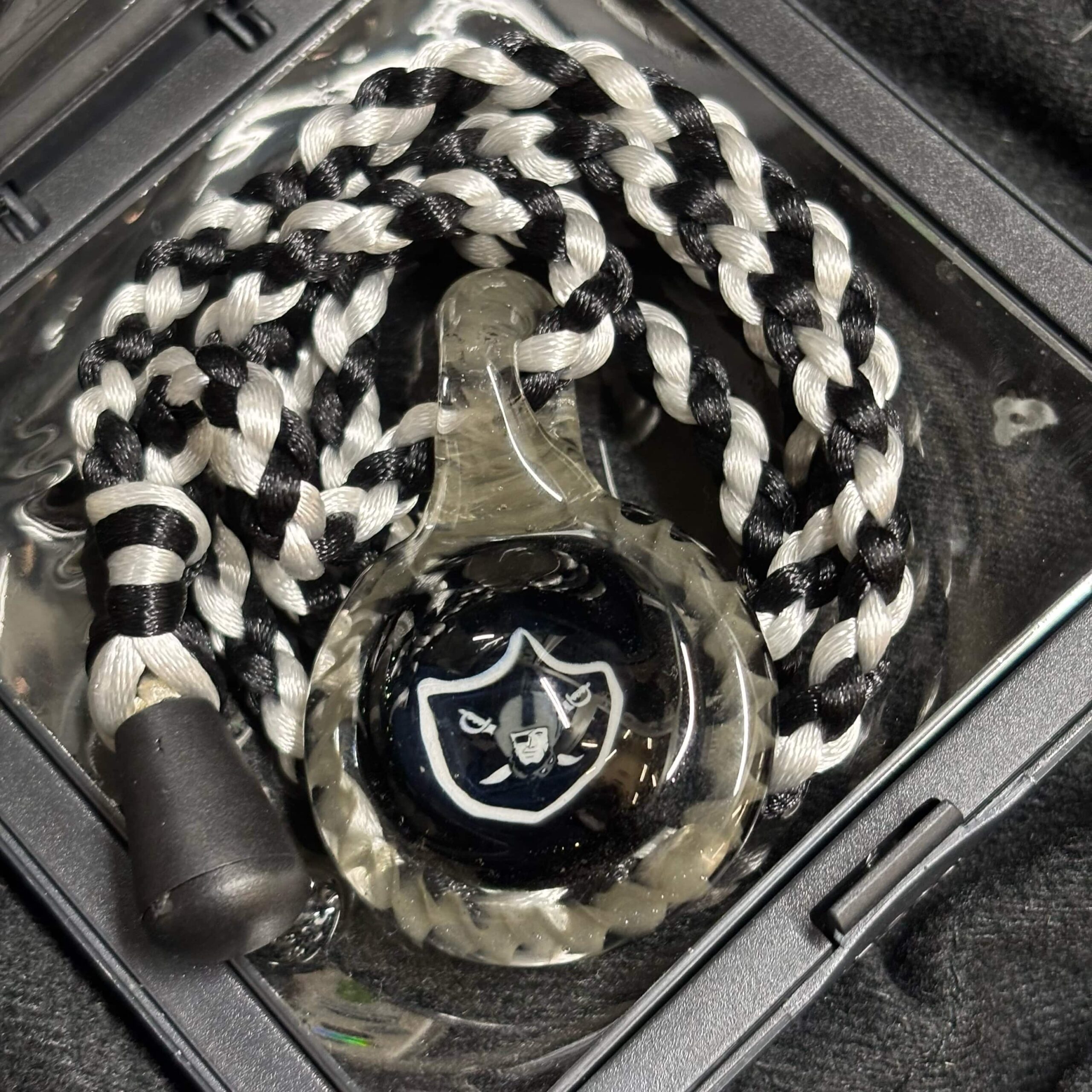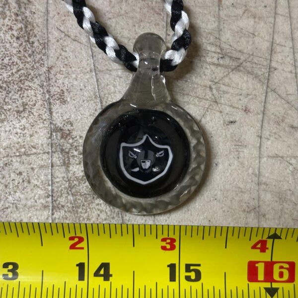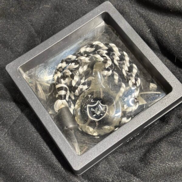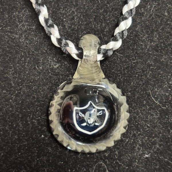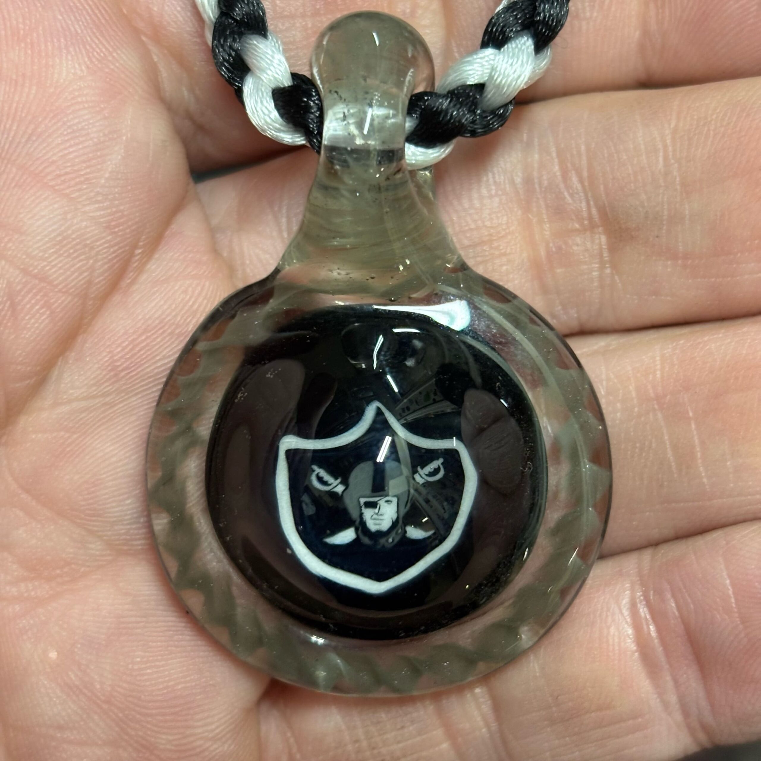 Las Vegas Raiders glass pendant and chain/necklace – Handmade in the USA featuring Las Vegas Raiders logo backed with black framed in silver twisty cane and strung up on a black and silver chain/necklace. Pendant size can vary from 1-1.5 inches although most are 1.25 inches in diameter