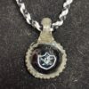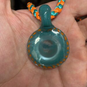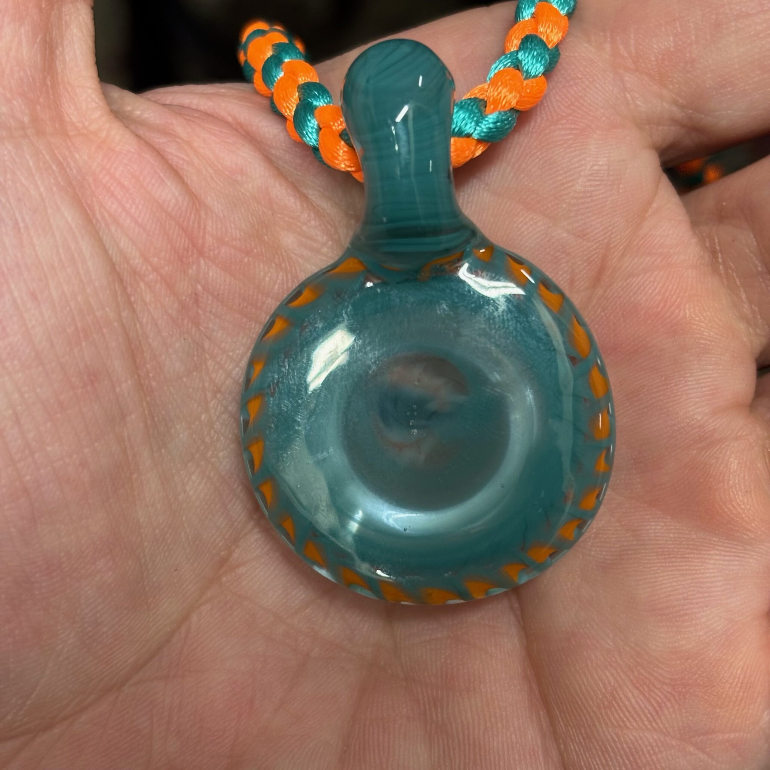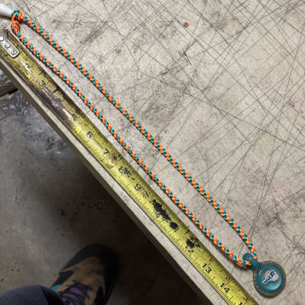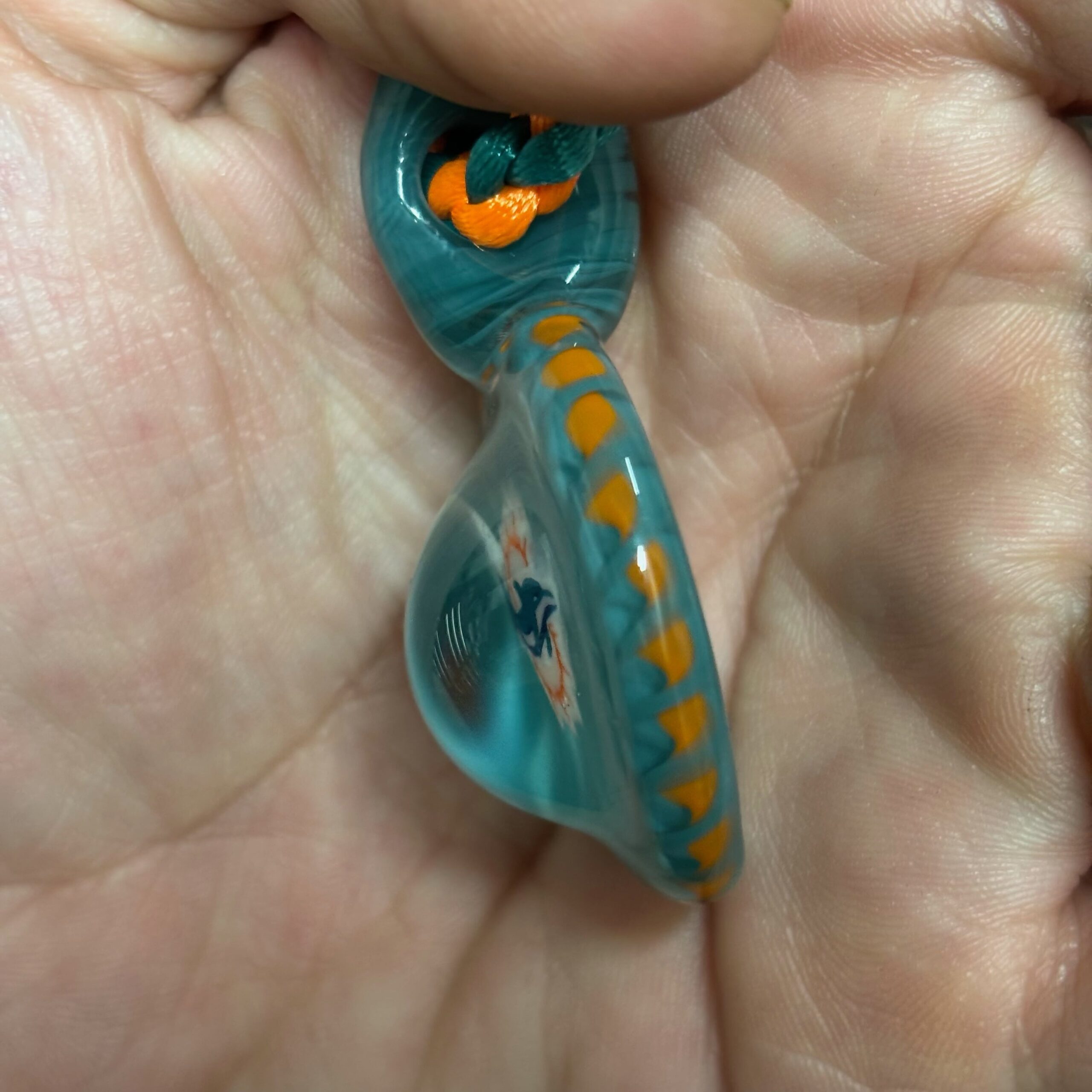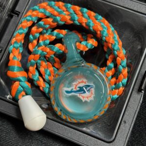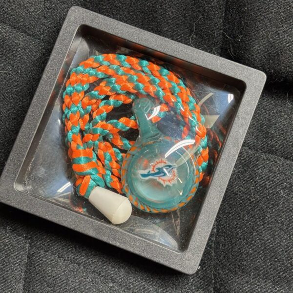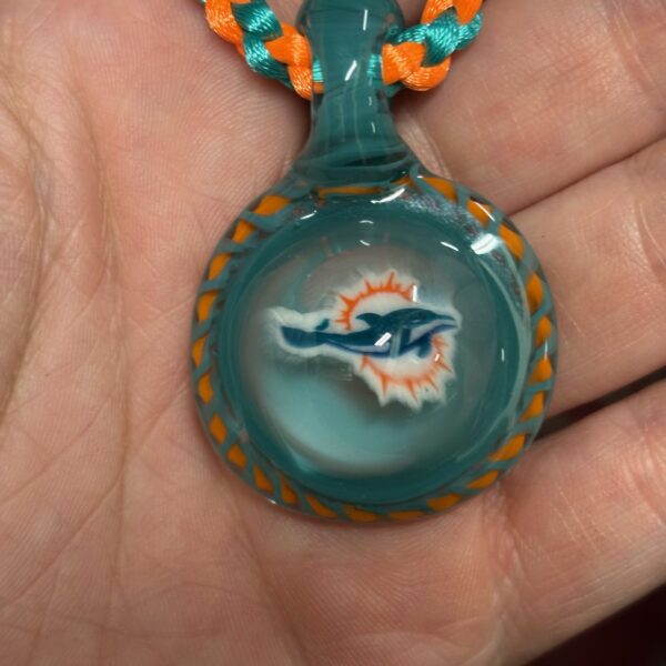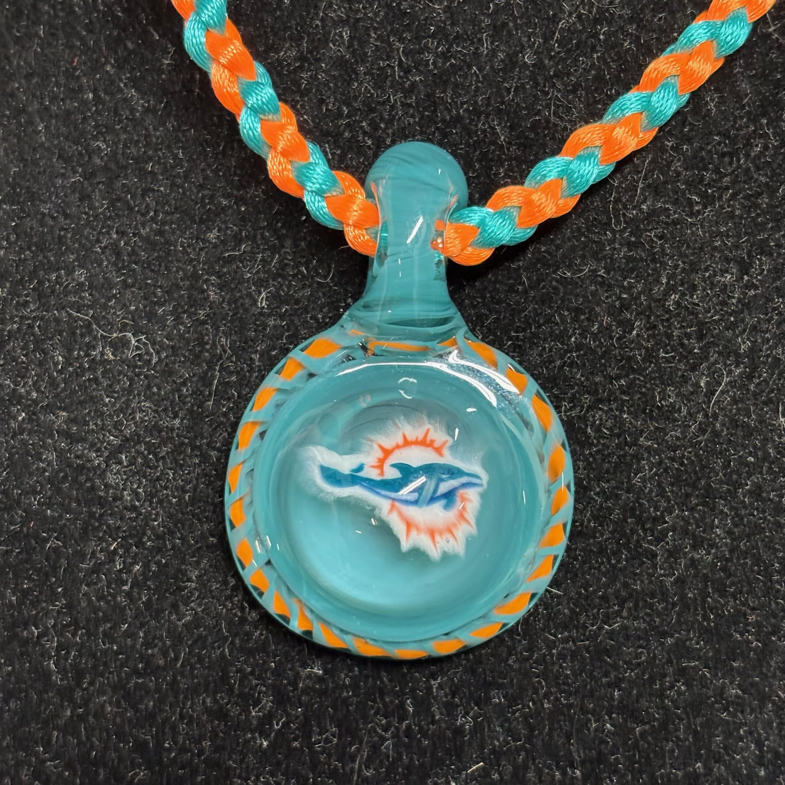 Miami Dolphins glass pendant and chain/necklace – Handmade in the USA featuring Miami Dolphins logo backed with blue framed in blue and orange twisty cane and strung up on a blue and orange chain/necklace. Pendant size can vary from 1-1.5 inches although most are 1.25 inches in diameter