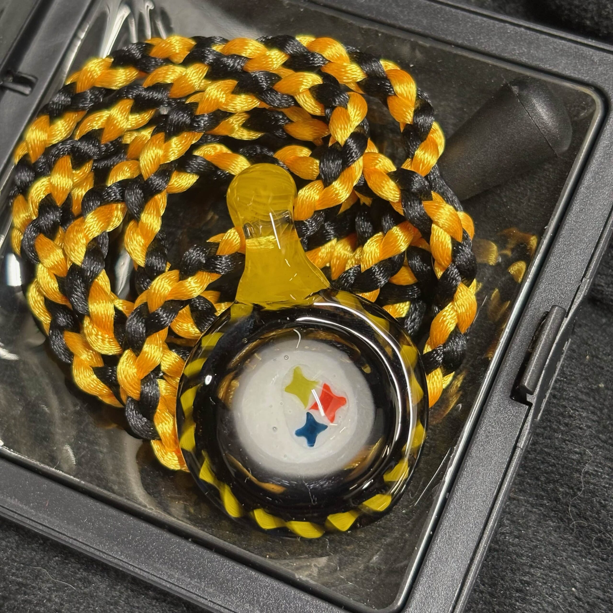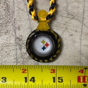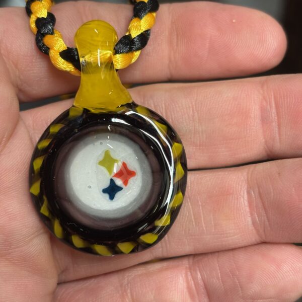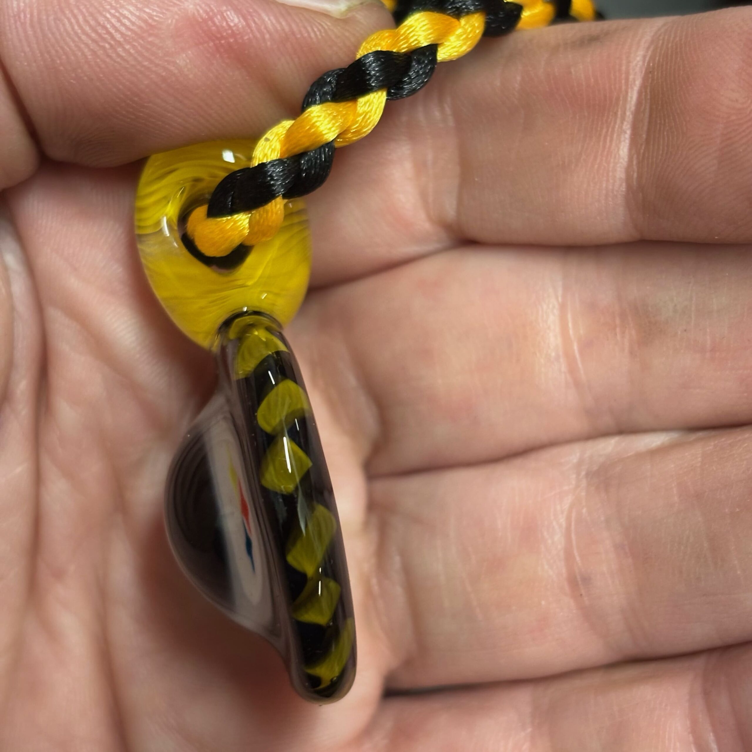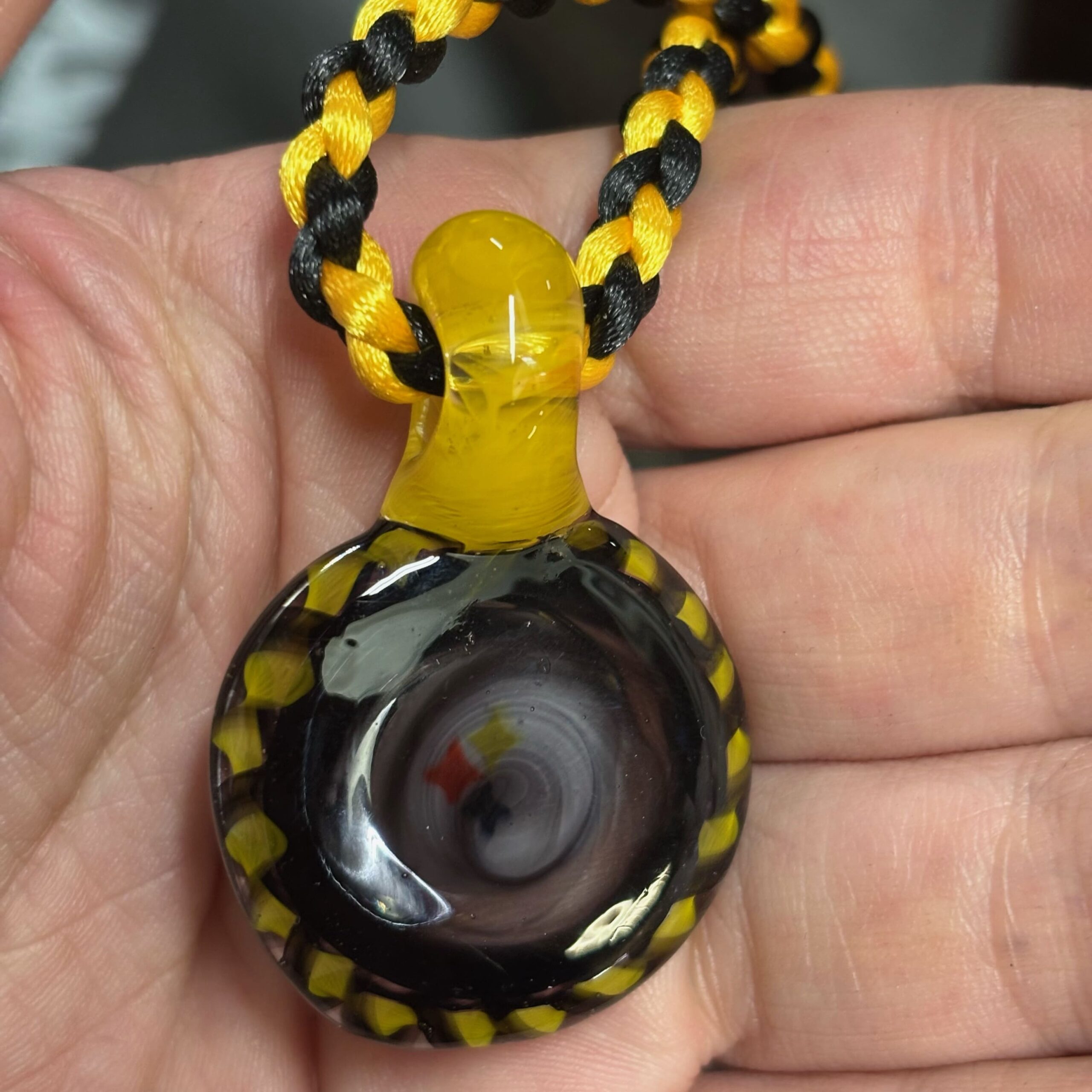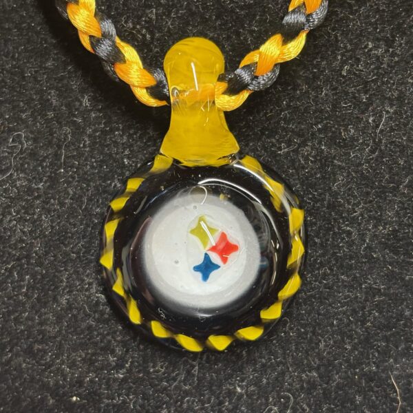 Pittsburgh Steelers glass pendant and chain/necklace – Handmade in the USA featuring Pittsburgh Steelers logo backed with black framed in black and yellow twisty cane and strung up on a black and yellow chain/necklace. Pendant size can vary from 1-1.5 inches although most are 1.25 inches in diameter