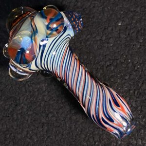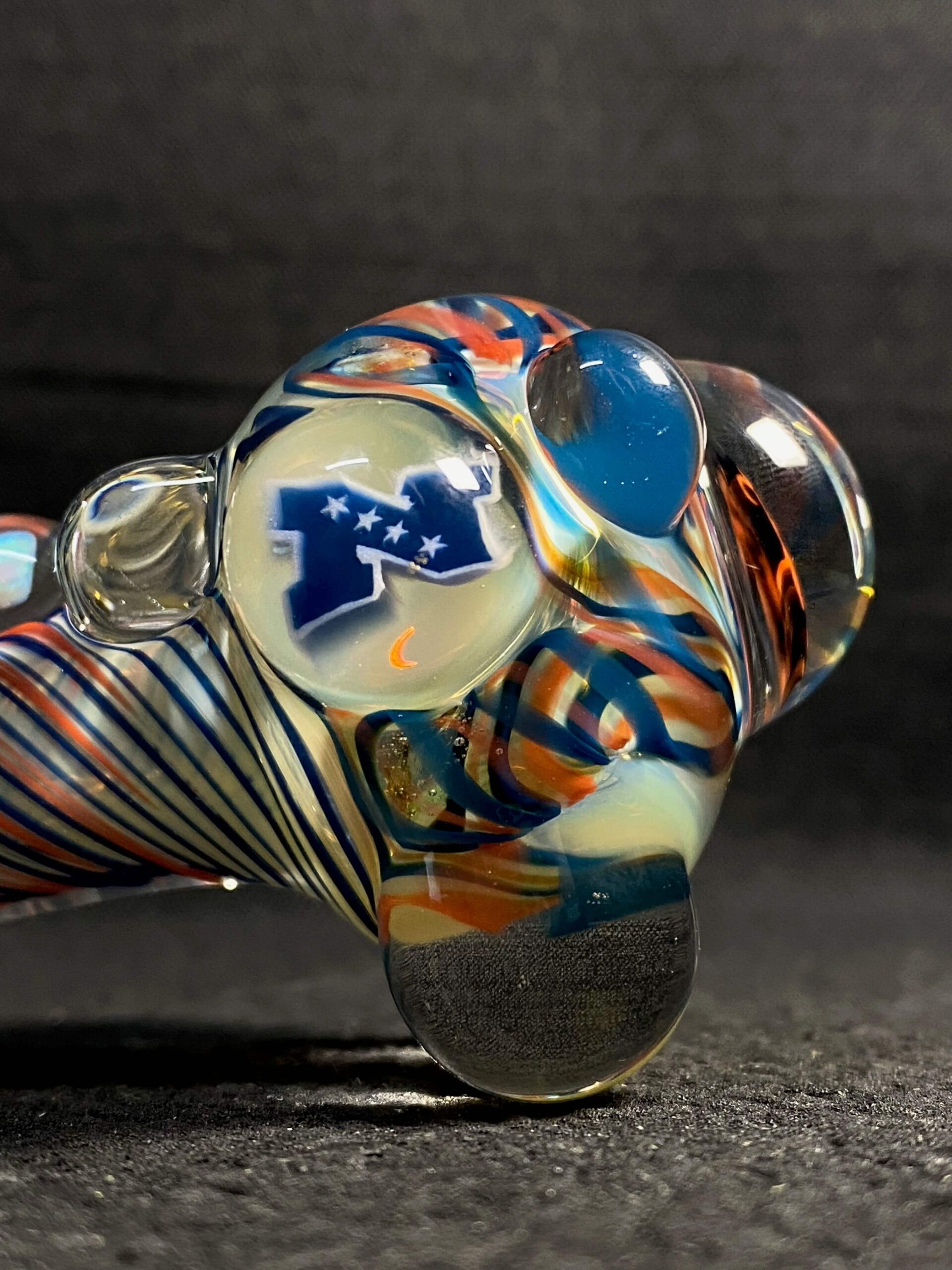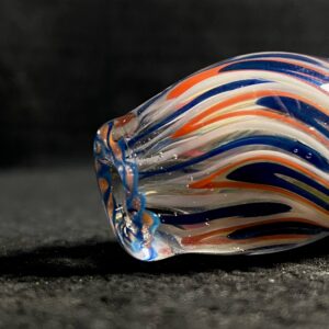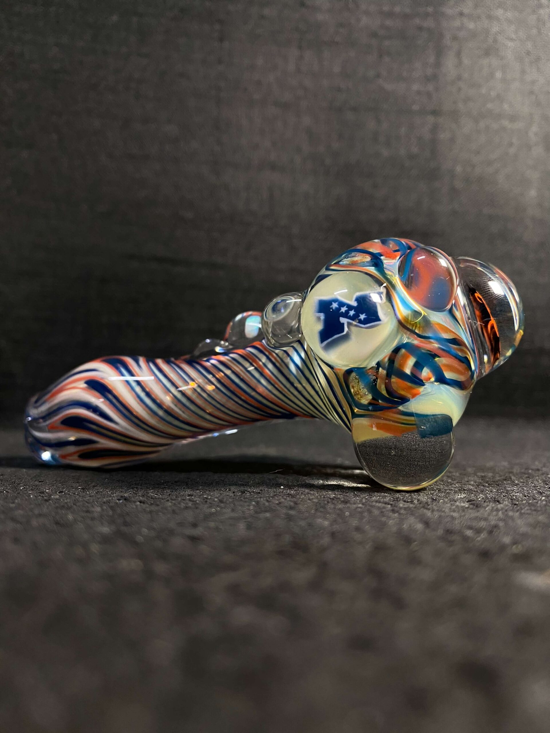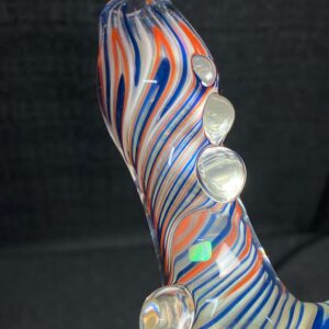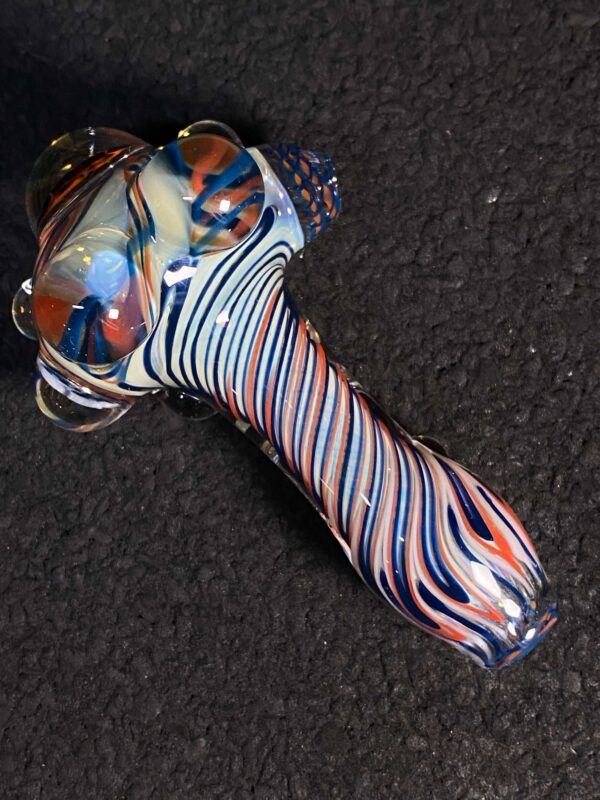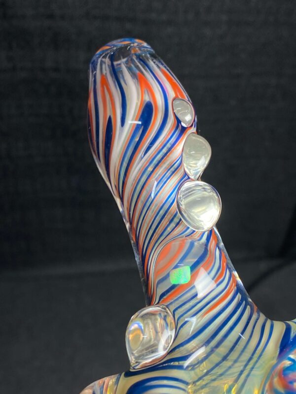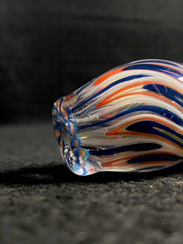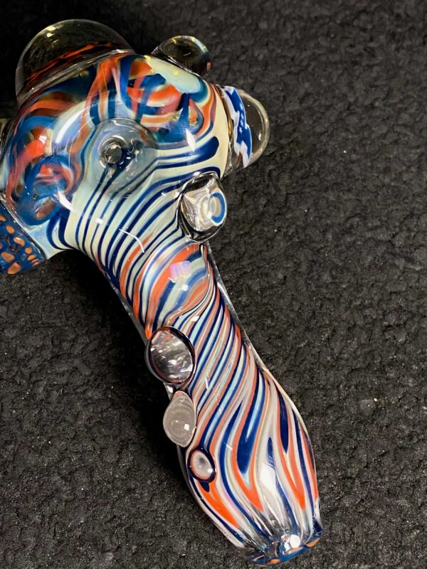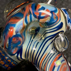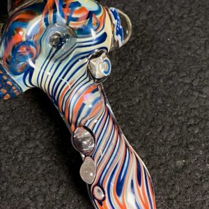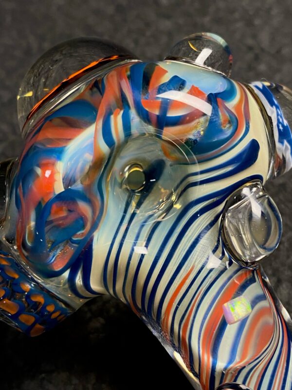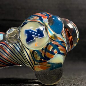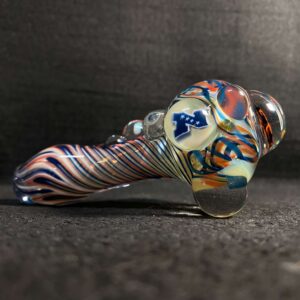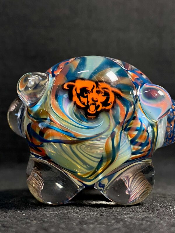 Chicago Bears hand blown glass tobacco pipe; orange and blue highlights fumed with 99.9 pure silver for color changing effects. This pipe is made in the “inside out” style, with beautiful orange and blue twisty cane spun through the head, with orange, blue and white stringers throughout the body. It features a Chicago Bears logo on the front, an NFC logo on the side, an opal on the neck, several twisty cane highlights, and clear marbles from head to toe. All 32 teams available.