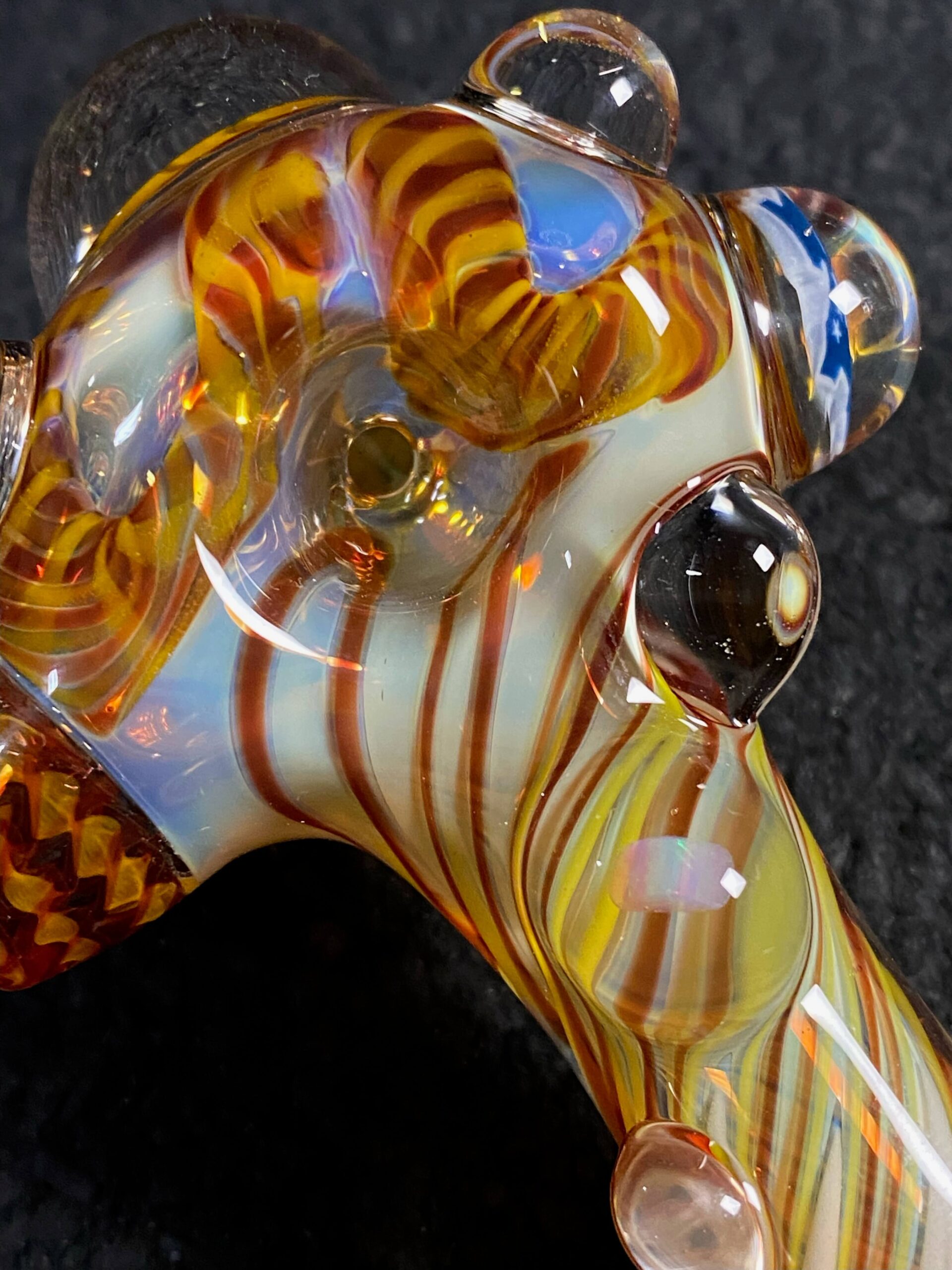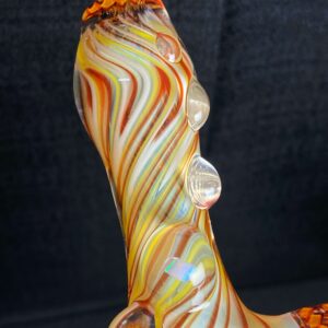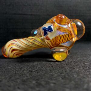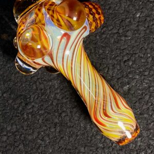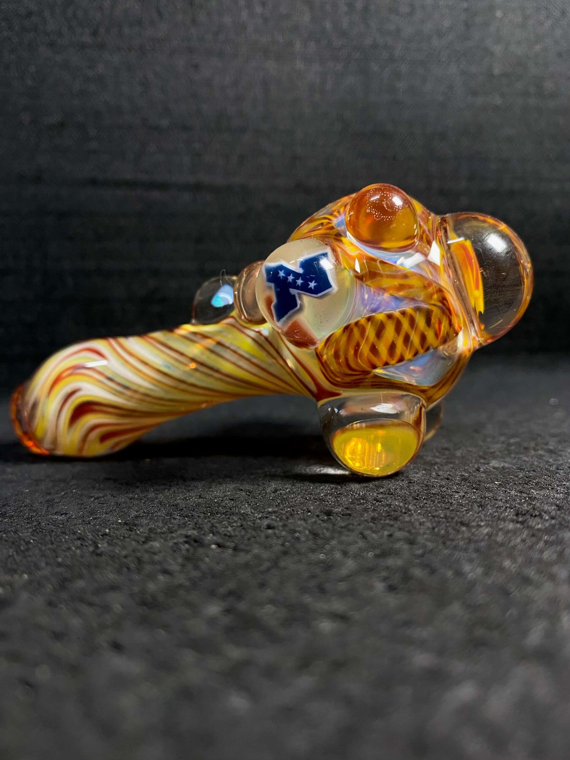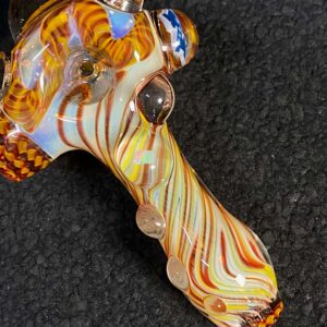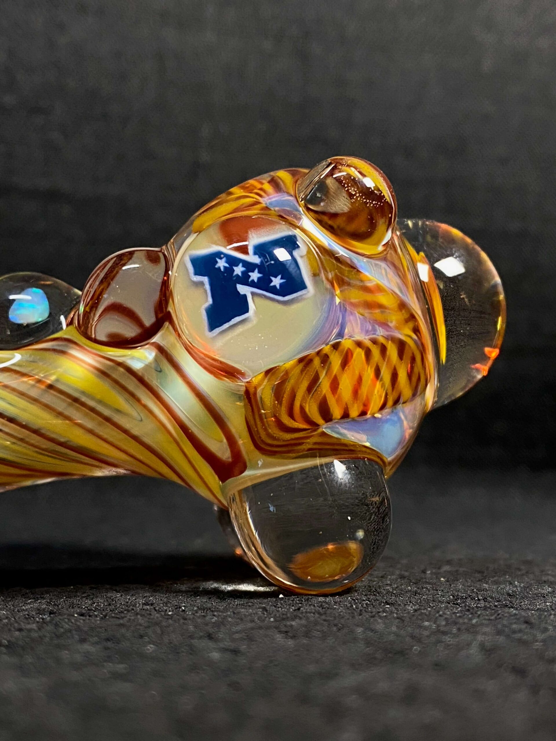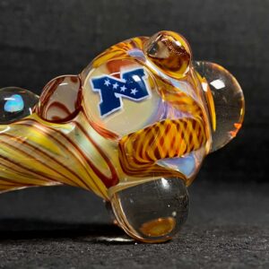 Washington Commanders hand blown glass tobacco pipe; red and gold highlights fumed with 99.9 pure silver for color changing effects. This pipe is made in the “inside out” style, with beautiful red and gold twisty cane spun through the head, with red, gold and white stringers throughout the body. It features a Washington Commanders logo on the front, an NFC logo on the side, an opal on the neck, several twisty cane highlights, and clear marbles from head to toe. All 32 teams available.
