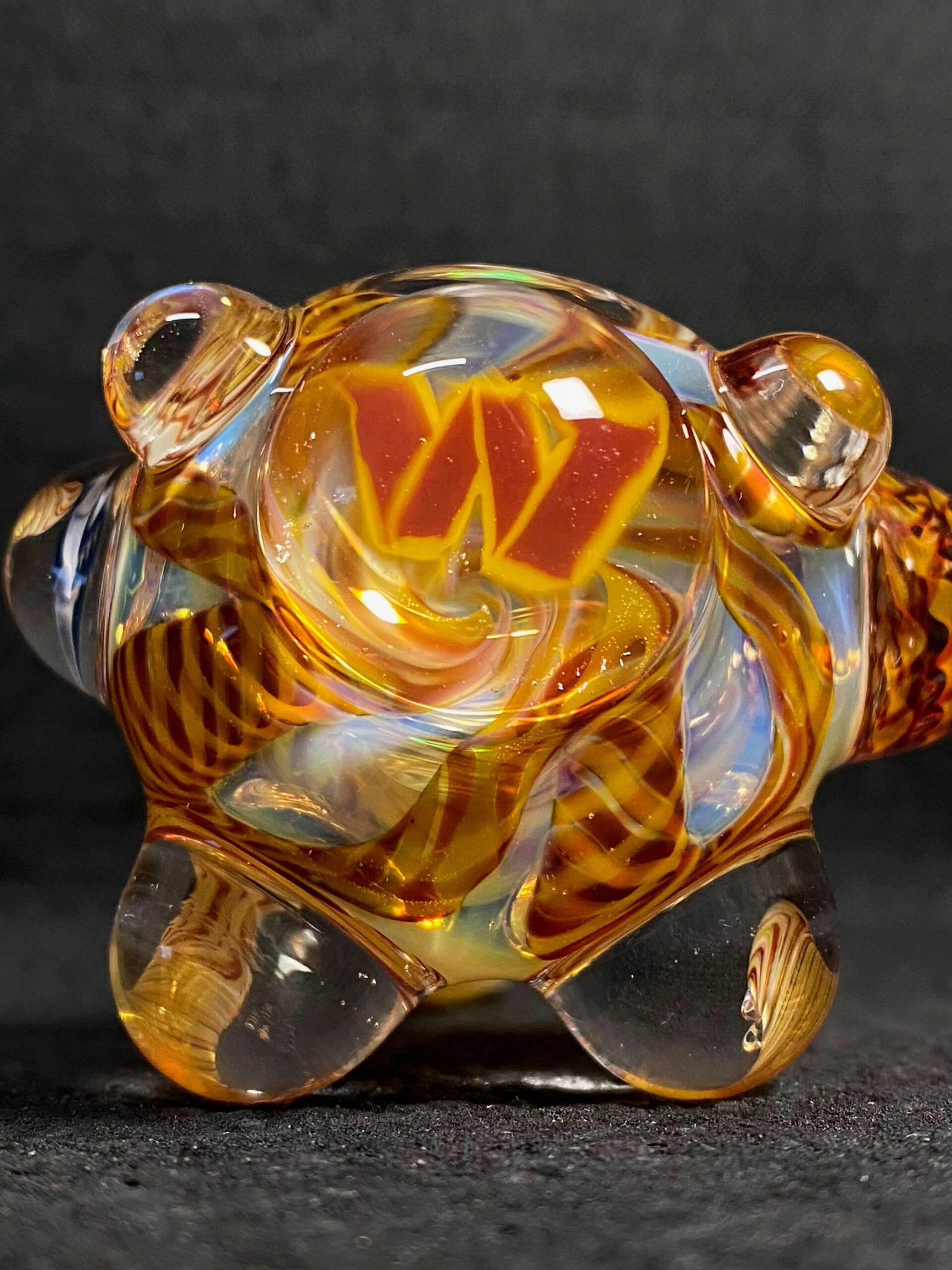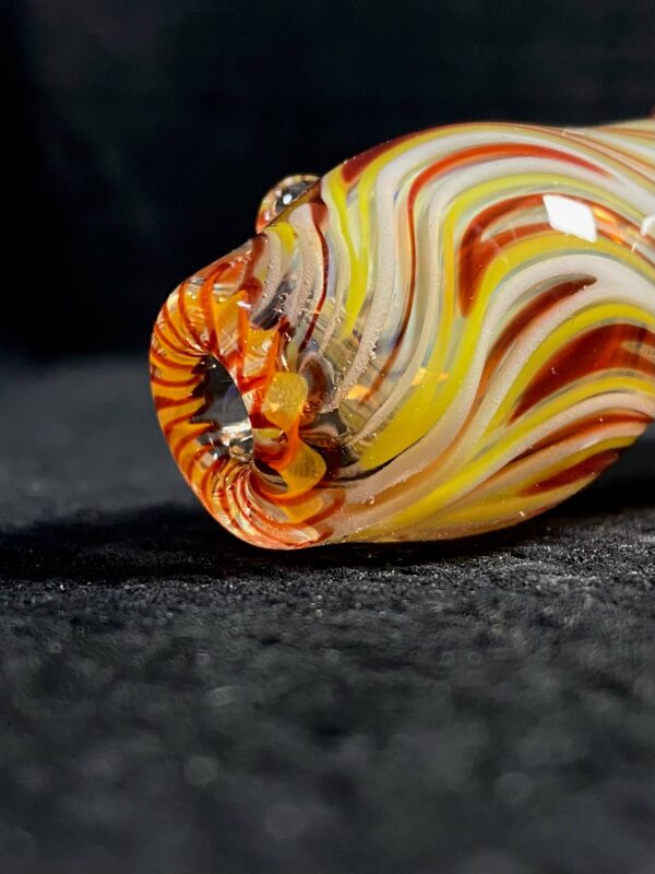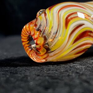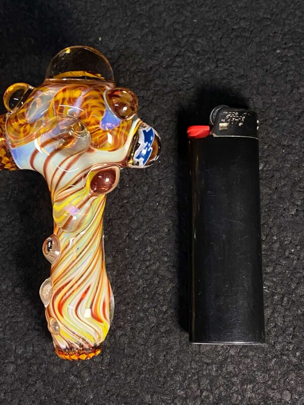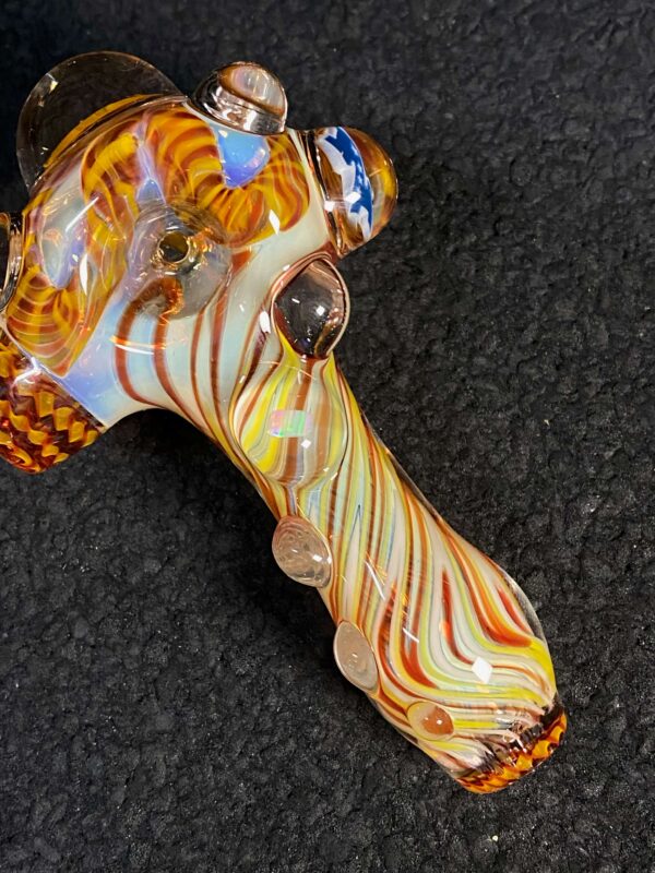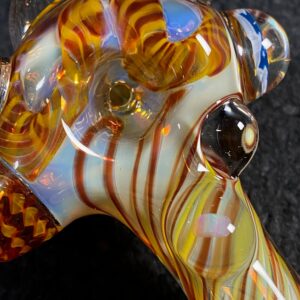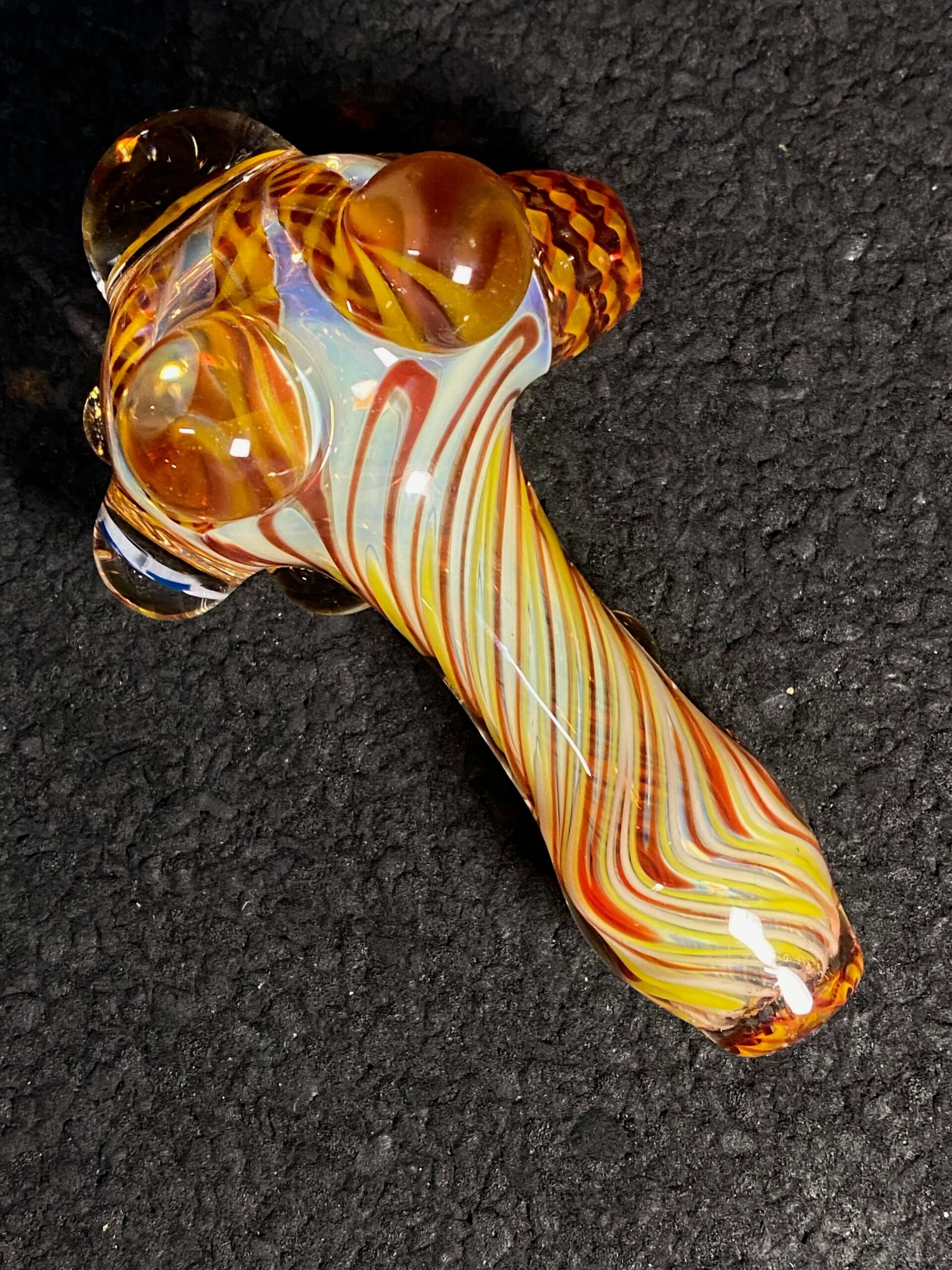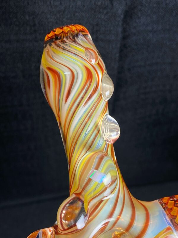 Washington Commanders hand blown glass tobacco pipe; red and gold highlights fumed with 99.9 pure silver for color changing effects. This pipe is made in the “inside out” style, with beautiful red and gold twisty cane spun through the head, with red, gold and white stringers throughout the body. It features a Washington Commanders logo on the front, an NFC logo on the side, an opal on the neck, several twisty cane highlights, and clear marbles from head to toe. All 32 teams available.